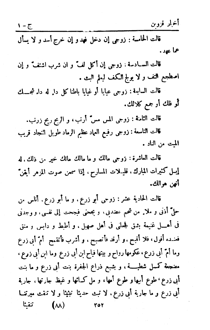 قَالَتِ الْحَادِيَةُ: عَشَرَةَ زَوْجِي أَبُو زَرْعٍ وَمَا أَبُو زَرْعٍ أَنَاسَ مِنْ حُلِيٍّ أُذُنَيَّ وَمَلاءَ مِنْ شحم عضدبي وَبَجَّحَنِي فَبَجَحْتُ إِلَى نَفْسِي وَوَجَدَنِي فِي أَهْلِ غُنَيْمَةٍ بِشِقٍّ فَجَعَلَنِي في أهل صهيل وأطيط ودابس وَمُنَقٍّ فَعِنْدَهُ أَقُولَ فَلا أُقَبِّحُ وَأَرُقُد فَأَتَصَبَّحُ وَأَشْرَبُ فَأَتَقَمَّحُ أَمُّ أَبِي زَرْعٍ وَمَا أُمُّ أَبِي زَرْعٍ عُكُومُهَا رَوَاحٌ وَبَيْتُهَا فَيَّاحٌ ابْنُ أَبِي زَرْعٍ وَمَا ابْنُ أَبِي زَرْعٍ مَضْجَعَةٌ كَمَسَلِّ شَطْبَةٍ وبشبع ذِرَاعُ الْجَفْرَةِ بِنْتُ أَبِي زَرْعٍ وَمَا بِنْتُ أَبِي زَرْعٍ طَوْعُ أبيها وطوع أمها ومل كِسَائِهَا وَغَيْظُ جَارَتِهَا جَارِيَةُ أَبِي زَرْعٍ وَمَا جَارِيَةُ أَبِي زَرْعٍ لا تَبُثُّ حَدِيثًا تَبْثِيثًا وَلا تنقث ميرتنا