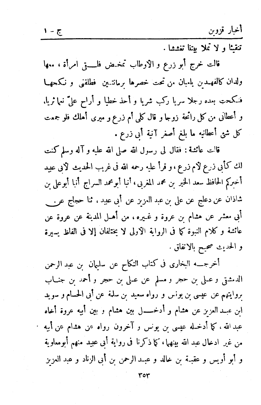 قَالَتْ عَائِشَةُ: فَقَالَ لِي رَسُولُ اللَّهِ صَلَّى اللَّهُ عليه وآله وَسَلَّمَ: "كُنْتُ لَكِ كَأَبِي زَرْعٍ لأُمِّ زَرْعٍ" وَقَرَأَ عَلَيْهِ رَحِمَهُ اللَّهُ فِي غَرِيبِ الْحَدِيثِ لأَبِي عُبَيْدٍ أَخْبَرَكُمْ الْحَافِظُ سَعْدُ الْخَيْرِ بْنُ مُحَمَّدٍ الْمَغْرِبِيُّ أَنْبَأَ أَبُو مُحَمَّدٍ السَّرَّاجُ أَنْبَأَ أَبُو عَلِيِّ بْنُ شَاذَانَ عَنْ دَعْلَجٍ عَنْ عَلِيِّ بْنِ عَبْدِ الْعَزِيزِ عَنْ أَبِي عُبَيْدٍ ثنا حَجَّاجٌ عَنْ أَبِي مَعْشَرٍ عَنْ هِشَامِ بْنِ عُرْوَةَ وَغَيْرِهِ مِنْ أَهْلِ الْمَدِينَةِ عَنْ عُرْوَةَ عَنْ عَائِشَةَ وَكَلامُ النُّبُوَّةِ كَمَا فِي الرِّوَايَةِ الأُولَى لا يَخْتَلِفَانِ إِلا فِي أَلْفَاظٍ يَسِيرَةٍ وَالْحَدِيثُ صَحِيحٌ بِالاتِّفَاقِ.