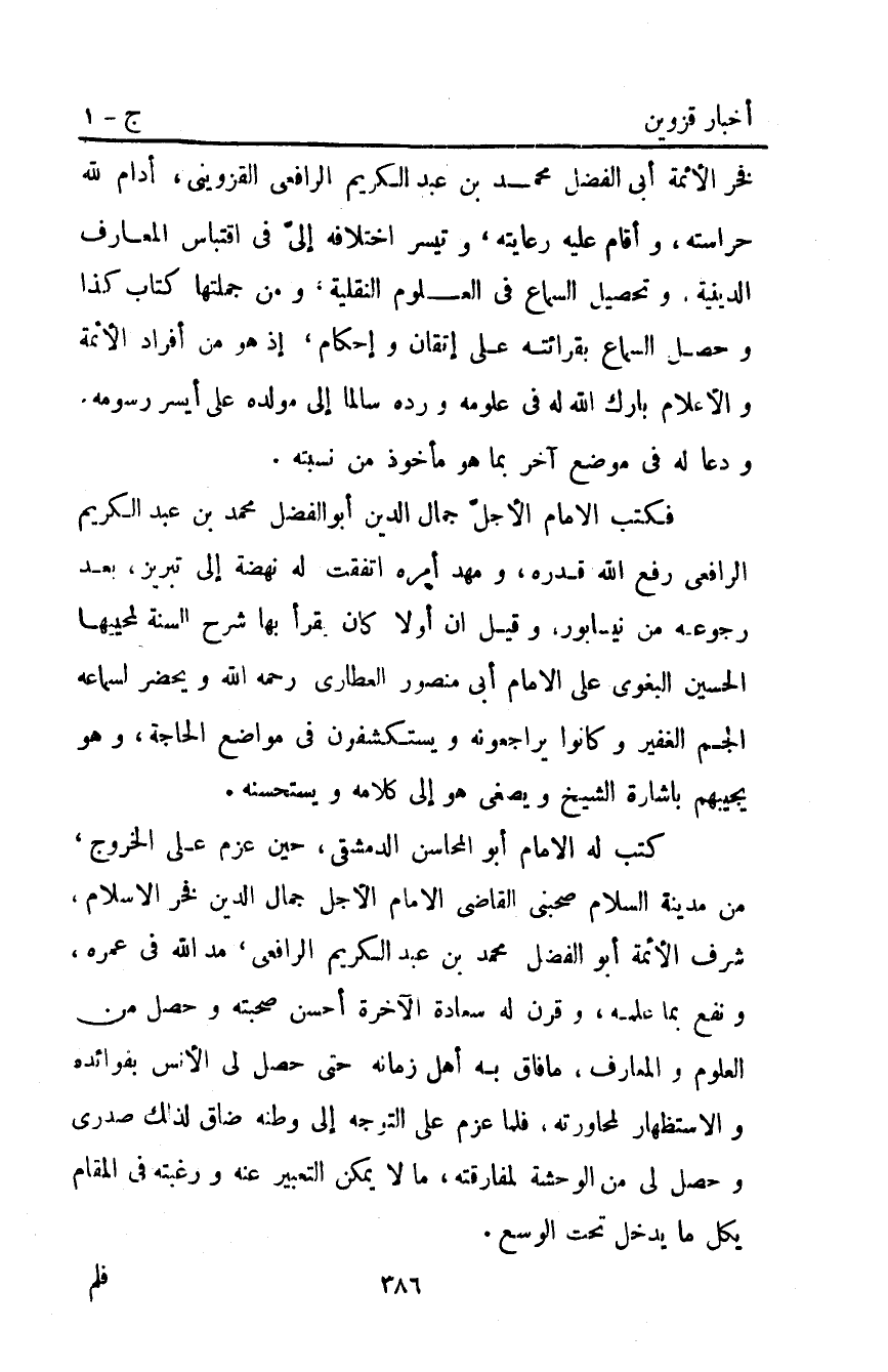 فخر الأئمة أبي الفضل مُحَمَّد بْن عَبْد الكريم الرافعي القزويني أدام اللَّه حراسته وأقام عليه رعايته وتيسر اختلافه إلي في اقتباس المعارف الدينية وتحصيل السماع في العلوم النقلية ومن جملتها كتاب كذا وحصل السماع بقرائته على إتقان وإحكام إذ هو من أفراد الأئمة والأعلام بارك اللَّه له في علومه ورده سالما إلى مولده على أيسر رسومه ودعا له في موضع آخر بما هو مأخوذ من نسبته.