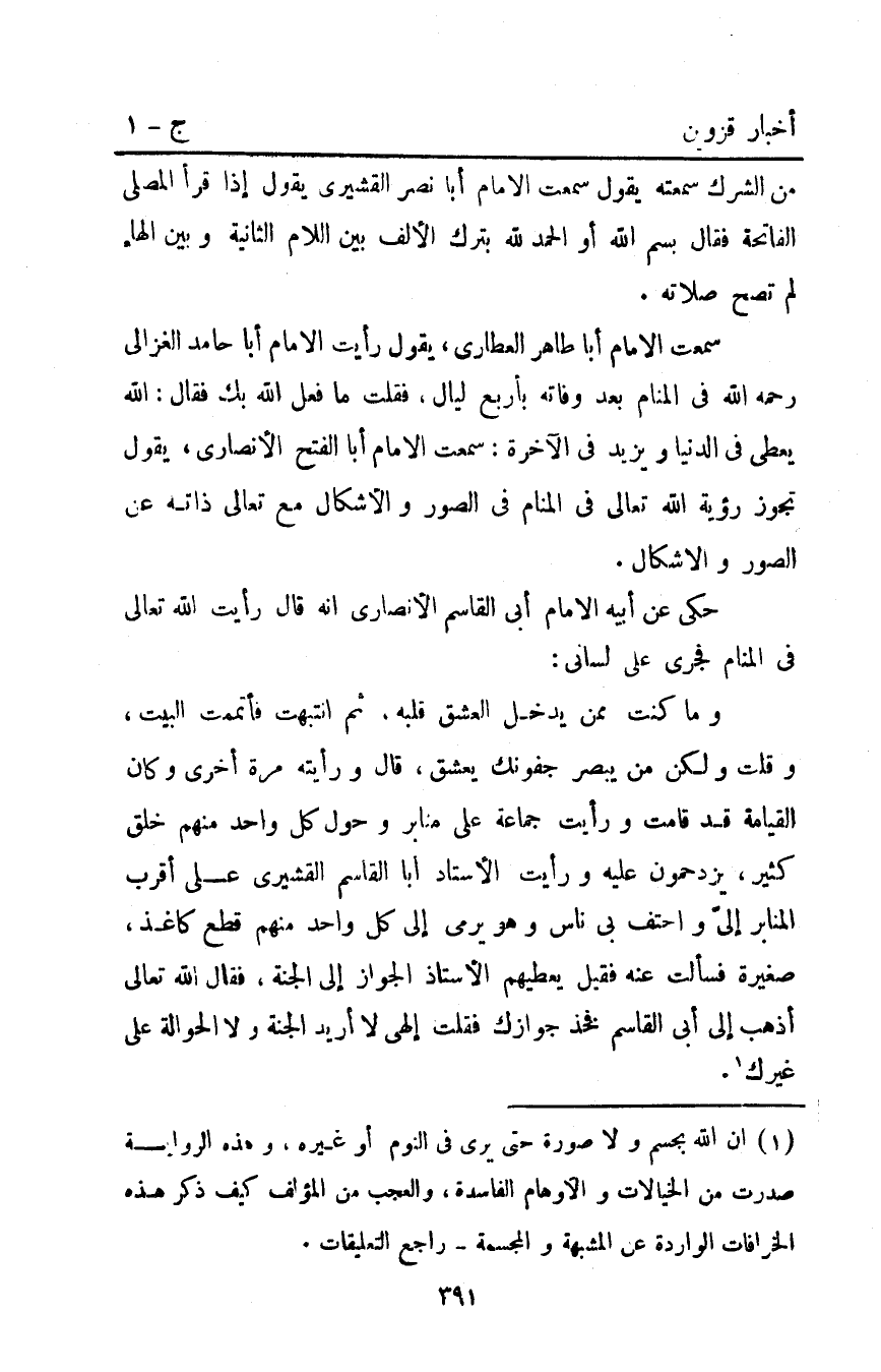سمعت الإمام أبا طاهر العطاري يقول: رأيت الإمام أبا حامد الغزالي رحمه اللَّه في المنام بعد وفاته بأربع ليال فقلت: ما فعل اللَّه بك؟ فقال: اللَّه يعطي في الدنيا ويزيد في الآخرة سمعت الإمام أبا الفتح الأنصاري يقول: تجوز رؤية اللَّه تعالى في المنام في الصور والأشكال مع تعالى ذاته عن الصور والأشكال.