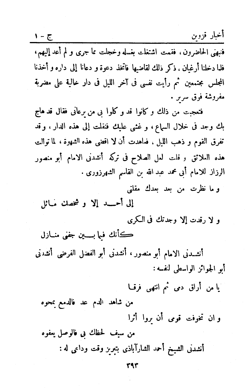 فتعجبت من ذلك وكانوا قد وكلوا بي من يرعاني فقال قد هاج بك وجد في خلال السماع وغشي عليك فنقلت إلى هذه الدار وقد تفرق القوم وذهب الليل فعاهدت أن لا أقضي هذه الشهوة لما توالت هذه العلائق وقلت لعل الصلاح في تركه أنشدني الإمام أبو منصور الرزاز للإمام أبي مُحَمَّد عَبْد اللَّه بْن القاسم الشهرزوري.