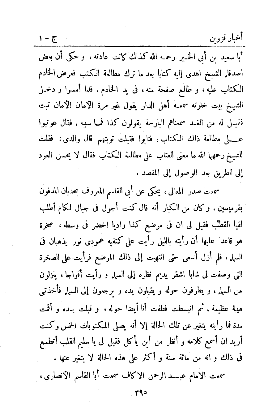سمعت صدر المعالي يحكي عن أبي القاسم المعروف بحدبان المدفون بقرميسين وكان من الكبار أنه قَالَ كنت أجول في جبال لكام أطلب لقيا القطب فقيل لي إن في موضع كذا واديا أخضر في وسطه صخرة هو قاعد عليها إن رأيته بالليل رأيت على كتفيه عمودي نور يذهبان في السماء فلم أزل أسعى حتى انتهيت إلى ذلك الموضع فرأيت على الصخرة التي وصفت لي شابا أشقر يديم النظر إلى السماء ورأيت أفواجا ينزلون من السماء ويطوفون حوله ويقبلون يده ويرجعون إلى السماء فأخذتني هيبة عظيمة ثم انبسطت فطفت أنا أيضا حوله وقبلت يده وأقمت مدة فما رأيته يغير عن تلك الحالة إلا أنه يصلي المكتوبات الخمس وكنت أريد أن أسمع كلامه وأنظر من أين يأكل فقيل لي يا سليم القلب أتطمع في ذلك وأنه من مائة سنة وأكثر على هذه الحالة لا يتغير عنها.