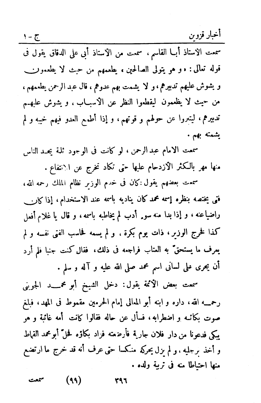 سمعت بعض الأئمة يقول: دخل الشيخ أبو مُحَمَّد الجويني رحمه اللَّه داره وابنه أبو المعالي إمام الحرمين مقموط في المهد فبلغ صوت بكائه واضطرابه فسأل عن حاله فقالوا: كانت أمه غائبة وهو يبكي فدعونا من دار فلان جارية فأرضعته فزاد بكاؤه فحل أبو مُحَمَّد القماط وأخذ برجليه ولم يزل يحركه منكسا حتى عرف أنه قد خرج ما ارتضع منها احتياطا منه في تربية ولده.
