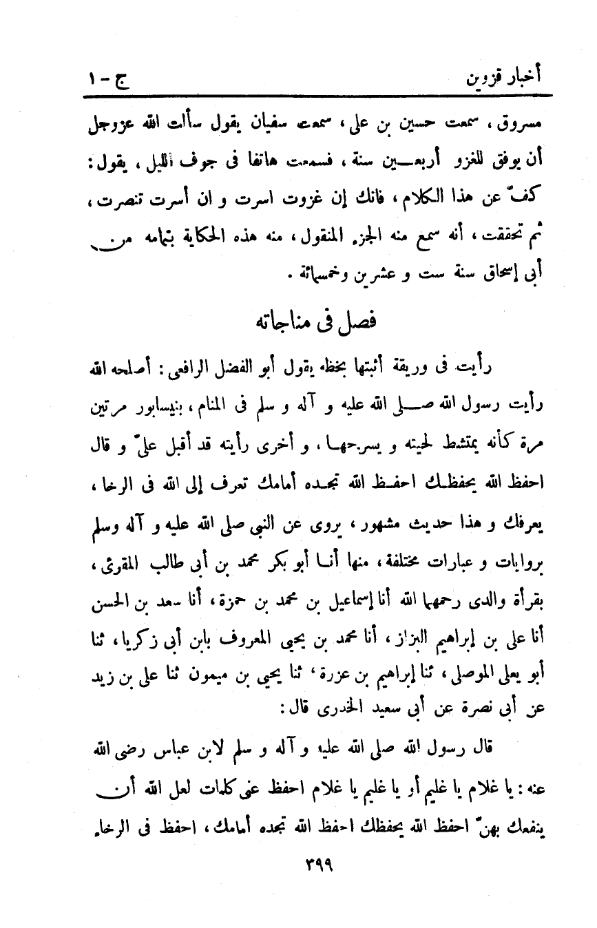 رأيت في وريقة أثبتها بخظه يقول أبو الفضل: الرافعي أصلحه اللَّه رأيت رسول اللَّه صَلَّى اللَّهُ عَلَيْهِ وَآلِهِ وَسَلَّمَ فِي المنام بنيسابور مرتين مرة كأنه يمتشط لحيته ويسرحها وأخرى رأيته قد أقبل علي وقال: "احفظ اللَّه يحفظك احفظ اللَّه تجده أمامك تعرف إلى اللَّه في الرخا يعرفك". وهذا حديث مشهور يروى عن النبي صَلَّى اللَّهُ عليه وآله وَسَلَّمَ بروايات وعبارات مختلفة منها أَنَا أَبُو بَكْرٍ مُحَمَّدُ بْنُ أبي طالب المقرىء بقرأة وَالِدَيَّ رَحِمَهُمَا اللَّهُ أَنَا إِسْمَاعِيلُ بْنُ مُحَمَّدِ بْنِ حَمْزَةَ أَنَا سَعْدُ بْنُ الْحَسَنِ أَنَا عَلِيُّ بْنُ إِبْرَاهِيمَ الْبَزَّازُ أَنَا مُحَمَّدُ بْنُ يَحْيَى الْمَعْرُوفُ بِابْنِ أَبِي زَكَرِيَّا ثَنَا أَبُو يَعْلَى الْمَوْصِلِيُّ ثَنَا إِبْرَاهِيمُ بْنُ عَزْرَةَ ثَنَا يَحْيَى بْنُ مَيْمُونٍ ثَنَا عَلِيُّ بْنُ زَيْدٍ عَنْ أَبِي نَصْرَةَ عَنْ أَبِي سَعِيدٍ الْخُدْرِيِّ قَالَ: