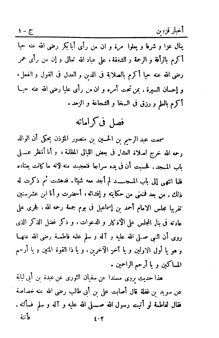 سَمِعْتُ عَبْدَ الرَّحِيمِ بْنَ الْحُسَيْنِ بْنِ مَنْصُورٍ الْمُؤَذِّنَ يَحْكِي أَنَّ الْوَالِدَ رَحِمَهُ اللَّهُ خَرَجَ لِصَلاةِ الْعِشَاءِ فِي بَعْضِ اللَّيَالِي الْمُظْلِمَةِ وَأَنَا أَنْتَظِرُ عَلَى بَابِ الْمَسْجِدِ فَحَسِبْتُ أَنَّ فِي يَدِهِ سِرَاجًا فَتَعَجَّبْتُ مِنْهُ لأَنَّهُ مَا كانت يَعْتَادُهُ فَلَمَّا انْتَهَى إِلَى بَابِ الْمَسْجِدِ لَمْ أَجِدْ مَعَهُ شَيْئًا فَدَهِشْتُ ثُمَّ ذَكَرْتُ لَهُ ذَلِكَ مَنْ بَعْدُ فَمَنَعَنِي مِنْ حِكَايَتِهِ وَإِفْشَائِهِ أُحْضِرْتُ وَأَنَا ابْنُ عَشْرِ سِنِينَ تَقْرِيبًا مَجْلِسَ الإِمَامِ أَحْمَدَ بْنِ إِسْمَاعِيلَ فِي يَوْمِ جُمُعَةٍ رَحِمَهُ اللَّهُ فَجَرَى عَلَى عَادَتِهِ فِي بِنَاءِ الْمَجْلِسِ عَلَى الأَذْكَارِ وَالدَّعَوَاتِ وَذَكَرَ فَضْلَ الذِّكْرِ الَّذِي رَوَى أَنَّ النَّبِيَّ صَلَّى اللَّهُ عليه وآله وَسَلَّمَ عَلَّمَهُ فَاطِمَةَ رَضِيَ اللَّهُ عَنْهَا وَهُوَ: "يَا أَوَّلَ الأَوَّلِينَ وَيَا آخِرَ الآخِرِينَ وَيَا ذَا الْقُوَّةِ الْمَتِينِ وَيَا أَرْحَمَ الْمَسَاكِينَ وَيَا أَرْحَمَ الرَّاحِمِينَ".