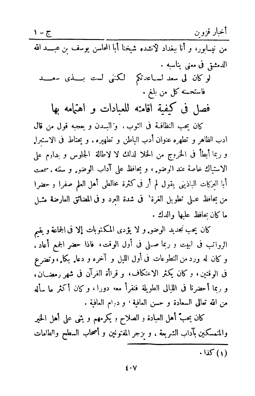 كان يحب تجديد الوضوء ولا يؤدي المكتوبات إلا في الجماعة ويقيم الرواتب في البيت وربما صلى في أول الوقت فإذا حضر الجمع أعاد وكان له ورد من التطوعات في أول الليل وآخره ودعاء بكاء وتضرع في الوقتين وكان يكثر الإعتكاف وقراأة القرآن في شهر رمضان وربما أحضرنا في الليالي الطويلة فنقرأ معه دورا وكان أكثر ما سأله من اللَّه تعالى السعادة وحسن العافية ودوام العافية.