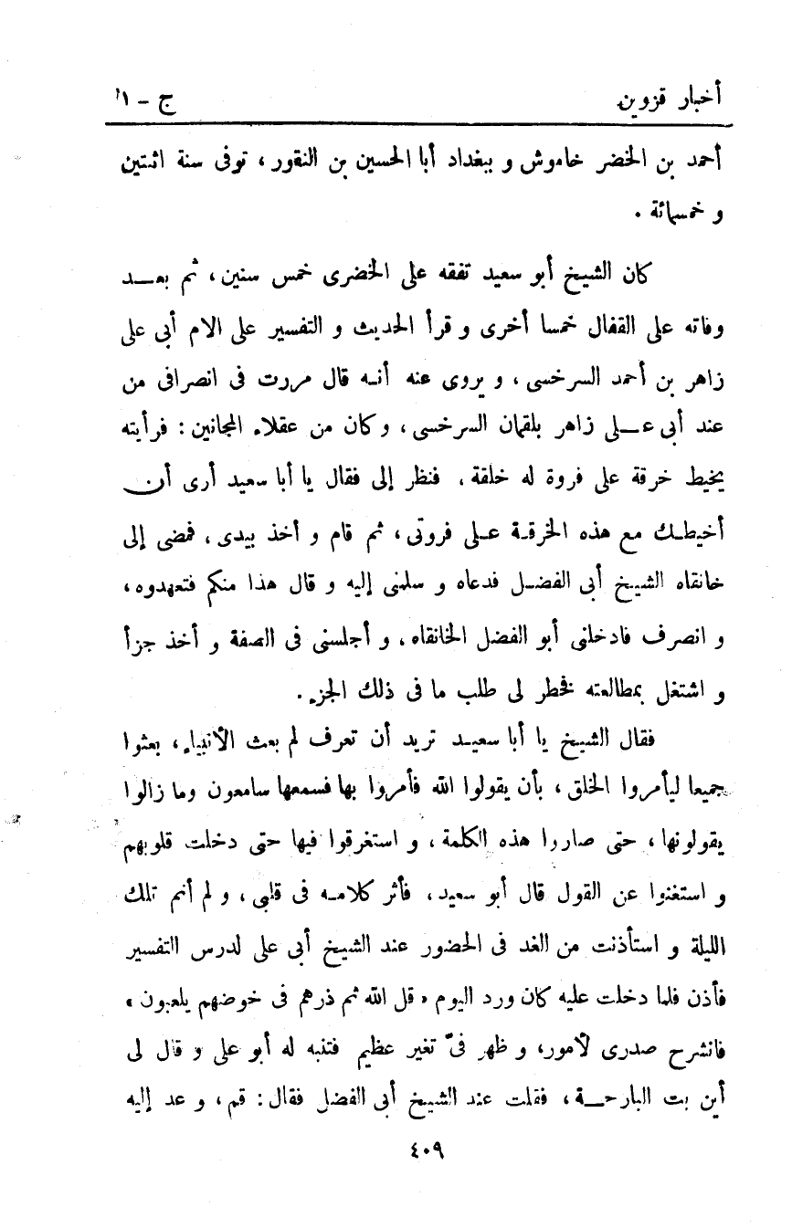 كان الشيخ أبو سعيد تفقه على الخضري خمس سنين ثم بعد وفاته على القفال خمسا أخرى وقرأ الحديث والتفسير على الإمام أبي علي زاهر بْن أَحْمَدَ السرخسي ويروى عنه أنه قَالَ مررت في انصرافي من عند أبي علي زاهر بلقمان السرخسي وكان من عقلاء المجانين فرأيته يخيط خرقة على فروة له خلقة فنظر إلي فقال يا أبا سعيد أرى أن أخيطك مع هذه الخرقة على فروتي ثم قام وأخذ بيدي فمضى إلى خانقاه الشيخ أبي الفضل فدعاه وسلمني إليه وقال هذا منكم فتعهدوه وانصرف فأدخلني أبو الفضل الخانقاه وأجلسني في الصفة وأخذ جزأ واشتغل بمطالعته فخطر لي طلب ما في ذلك الجزء.