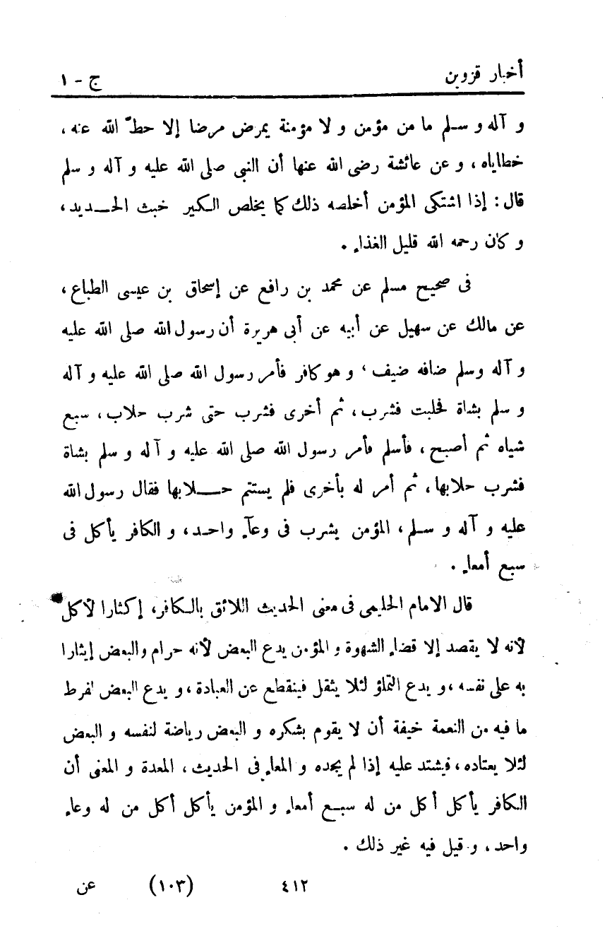في صحيح مسلم عَنْ مُحَمَّدِ بْنِ رَافِعٍ عَنْ إِسْحَاقَ بْنِ عِيسَى الطَّبَّاعِ عَنْ مَالِكٍ عَنْ سُهَيْلٍ عَنْ أَبِيهِ عَنْ أَبِي هُرَيْرَةَ أَنَّ رَسُولَ اللَّهِ صَلَّى اللَّهُ عَلَيْهِ وَآلِهِ وَسَلَّمَ ضَافَهُ ضَيْفٌ وَهُوَ كَافِرٌ فَأَمَرَ رَسُولُ اللَّهِ صَلَّى اللَّهُ عليه وآله وَسَلَّمَ بِشَاةٍ فَحُلِبَتْ فَشَرِبَ ثُمَّ أُخْرَى فَشَرِبَ حَتَّى شَرِبَ حِلابَ سَبْعِ شِيَاهٍ ثُمَّ أَصْبَحَ فَأَسْلَمَ فَأَمَرَ رَسُولُ اللَّهِ صَلَّى اللَّهُ عليه وآله وَسَلَّمَ بِشَاةٍ فَشَرِبَ حِلابَهَا ثُمَّ أَمَرَ لَهُ بِأُخْرَى فَلَمْ يَسْتَتِمَّ حِلابَهَا فَقَالَ رَسُولُ اللَّهِ صَلَّى الله عليه وآله وَسَلَّمَ: "الْمُؤْمِنُ يَشْرَبُ فِي وَعَاءٍ وَاحِدٍ وَالْكَافِرُ يَأْكُلُ فِي سَبْعِ أَمْعَاءٍ".