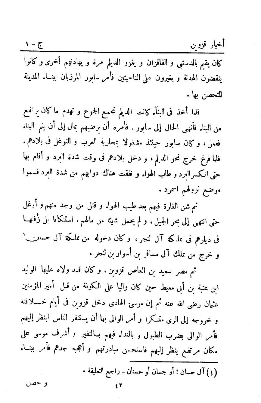 ثم مصر سعيد بْن العاص قزوين وكان قد ولاه عليها الوليد ابن عتبة بْن أبي معيط حين كان واليا على الكوفة من قبل أمير المؤمنين عثمان رضي اللَّه عنه ثم إن موسى الهادي دخل قزوين في أيام خلافته وخروجه إلى الري متنكرا وأمر الوالي بها أن يستنفر الناس لينظر إليهم فأمر الوالي بضرب الطبول وبالنداء فيهم بالنفير وأشرف موسى على مكان مرتفع ينظر إليهم فاستحسن مبادرتهم وأعجبه جدهم فأمر ببناء