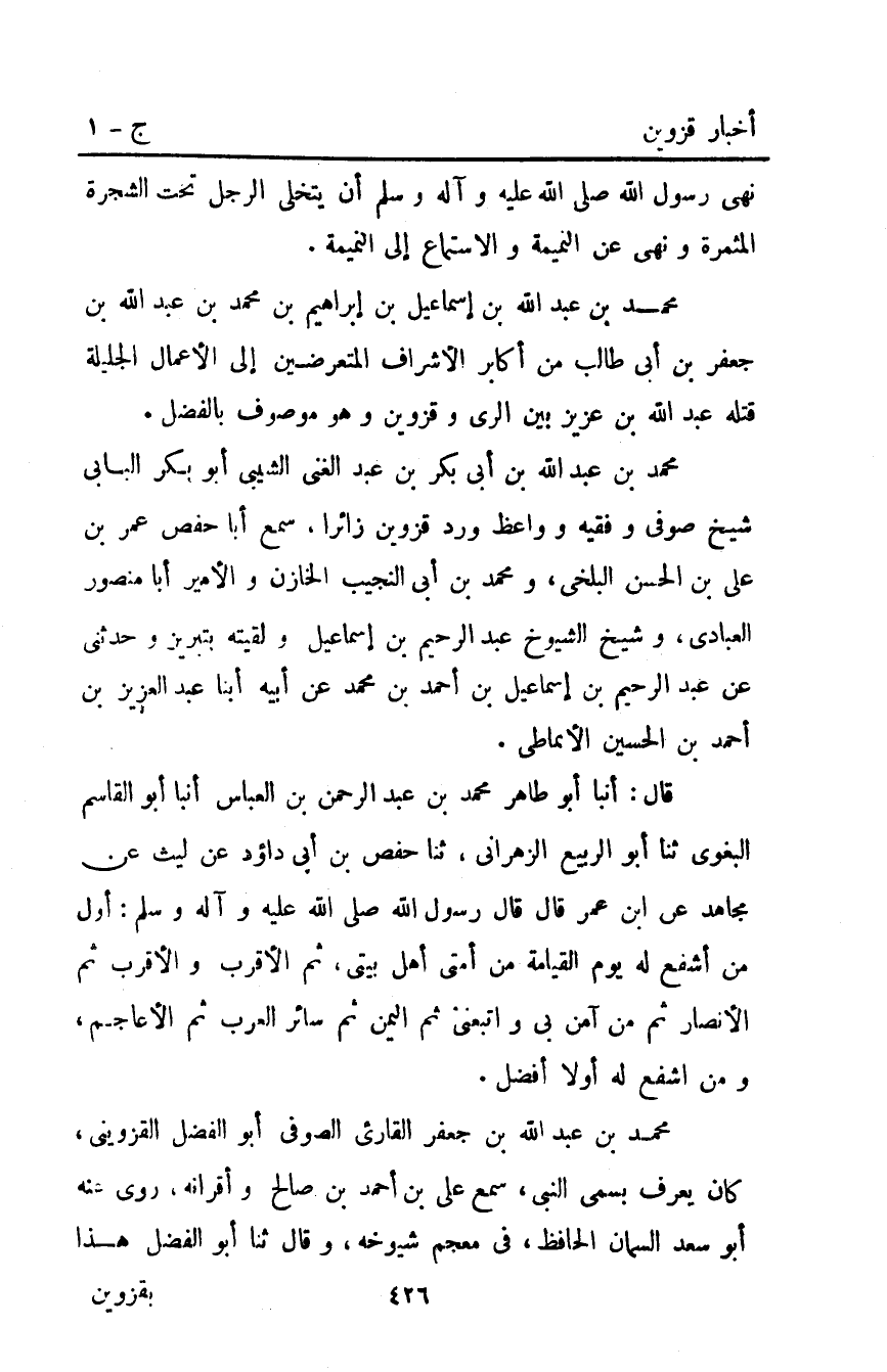 قَالَ: أَنْبَأَ أَبُو طَاهِرٍ مُحَمَّدِ بْنِ عَبْدِ الرَّحْمَنِ بْنِ الْعَبَّاسِ أَنْبأَ أَبُو الْقَاسِمِ الْبَغَوِيُّ ثَنَا أَبُو الرَّبِيعِ الزَّهْرَانِيُّ ثَنَا حفص بن أبي داؤد عَنْ لَيْثٍ عَنْ مُجَاهِدٍ عَنِ ابْنِ عُمَرَ قَالَ قَالَ رَسُولُ اللَّهِ صَلَّى اللَّهُ عَلَيْهِ وَآلِهِ وَسَلَّمَ: "أَوَّلُ مَنْ أَشْفَعُ لَهُ يَوْمَ الْقِيَامَةِ مِنْ أُمَّتِي أَهْلُ بَيْتِي ثُمَّ الأَقْرَبُ وَالأَقْرَبُ ثُمَّ الأَنصَارُ ثُمَّ مَنْ آمَنَ بِي وَاتَّبَعَنِي ثُمَّ الْيَمَنُ ثُمَّ سَائِرُ الْعَرَبِ ثُمَّ الأَعَاجِمُ وَمَنْ أَشْفَعُ لَهُ أَوَّلا أَفْضَلُ".