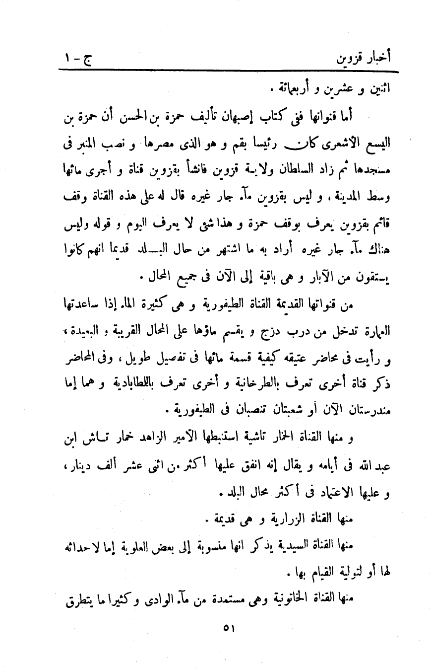 أما قنواتها ففي كتاب أصبهان تأليف حمزة بْن الحسن أن حمزة بْن اليسع الأشعري كان رئيسا بقم وهو الذي مصرها ونصب المنبر في مسجدها ثم زاد السلطان ولاية قزوين فأنشأ بقزوين قناة وأجرى مائها وسط المدينة وليس بقزوين ماء جار غيره قَالَ له على هذه القناة وقف قائم بقزوين يعرف بوقف حمزة وهذا شيء لا يعرف اليوم وقوله وليس هناك ماء جار غيره أراد به ما اشتهر من حال البلد قديما أنهم كانوا يستقون من الآبار وهي باقية إلى الآن في جميع المحال.