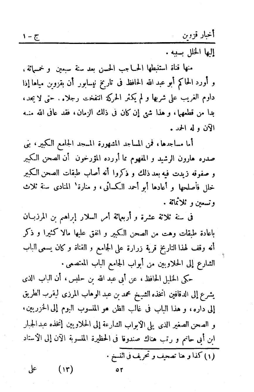 منها: قناة استنبطها الحاجب الحسن بعد سنة سبعين وخمسمائة وأورد الحاكم أبو عَبْد اللَّه الحافظ في تاريخ نيسابور أن بقزوين مياها إذا داوم الغريب على شربها ولم يكثر الحركة انتفخت رجلاه حتى لا يجد بدا من قطعهما وهذا شيء إن كان في ذلك الزمان فقد عافى اللَّه منه الآن وله الحمد.