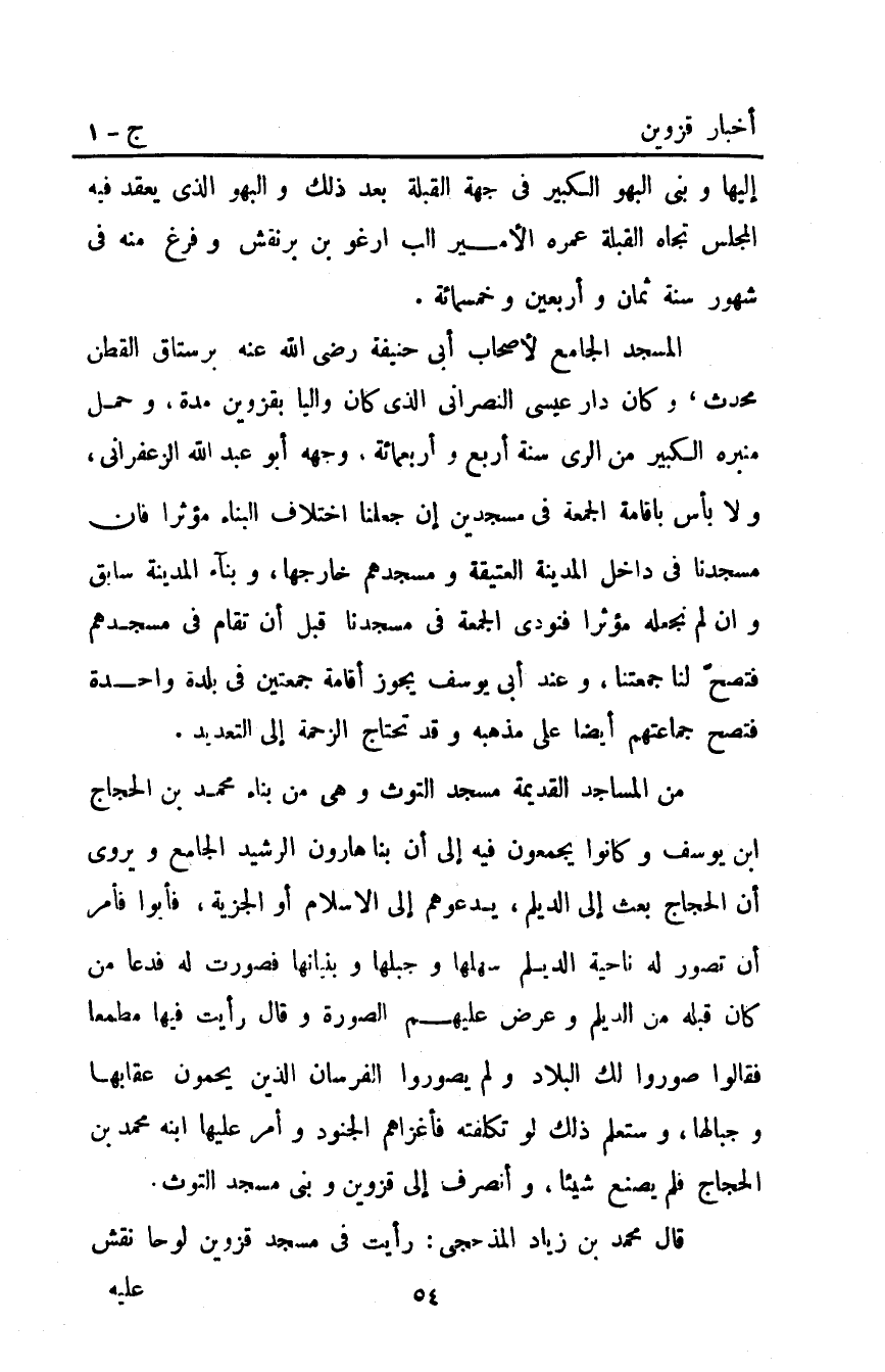 المسجد الجامع لأصحاب أبي حنيفة رضي اللَّه عنه برستاق القطن محدث وكان دار عيسى النصراني الذي كان واليا بقزوين مدة وحمل منبره الكبير من الري سنة أربع وأربعمائة وجهه أبو عَبْد اللَّه الزعفراني ولا بأس بإقامة الجمعة في مسجدين إن جعلنا اختلاف البناء مؤثرا فإن مسجدنا في داخل المدينة العتيقة ومسجدهم خارجها وبناء المدينة سابق وأن لم نجعله مؤثرا فنودي الجمعة في مسجدنا قبل أن تقام في مسجدهم فتصح لنا جمعتنا وعند أبي يوسف يجوز إقامة جمعتين في بلدة واحدة فتصح جماعتهم أيضا على مذهبه وقد تحتاج الزحمة إلى التعديد.