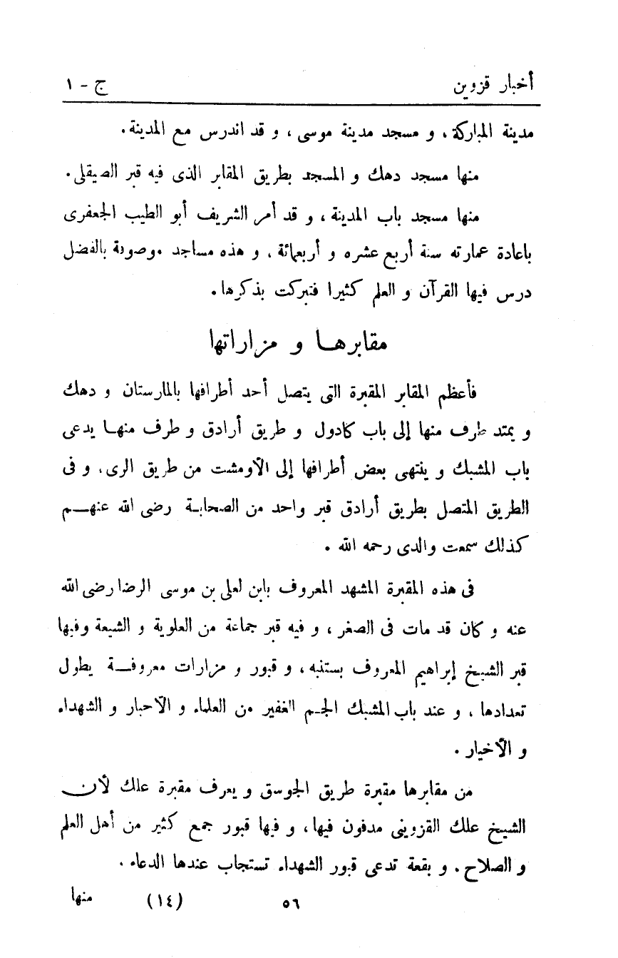 فأعظم المقابر المقبرة التي يتصل أحد أطرافها بالمارستان ودهك ويمتد طرف منها إلى باب كادول وطريق أرادق وطرف منها يدعى باب المشبك وينتهي بعض أطرافها إلى الأومشت من طريق الري وفي الطريق المتصل بطريق أرادق قبر واحد من الصحابة رضي اللَّه عنهم كذلك سمعت والدي رحمه اللَّه.