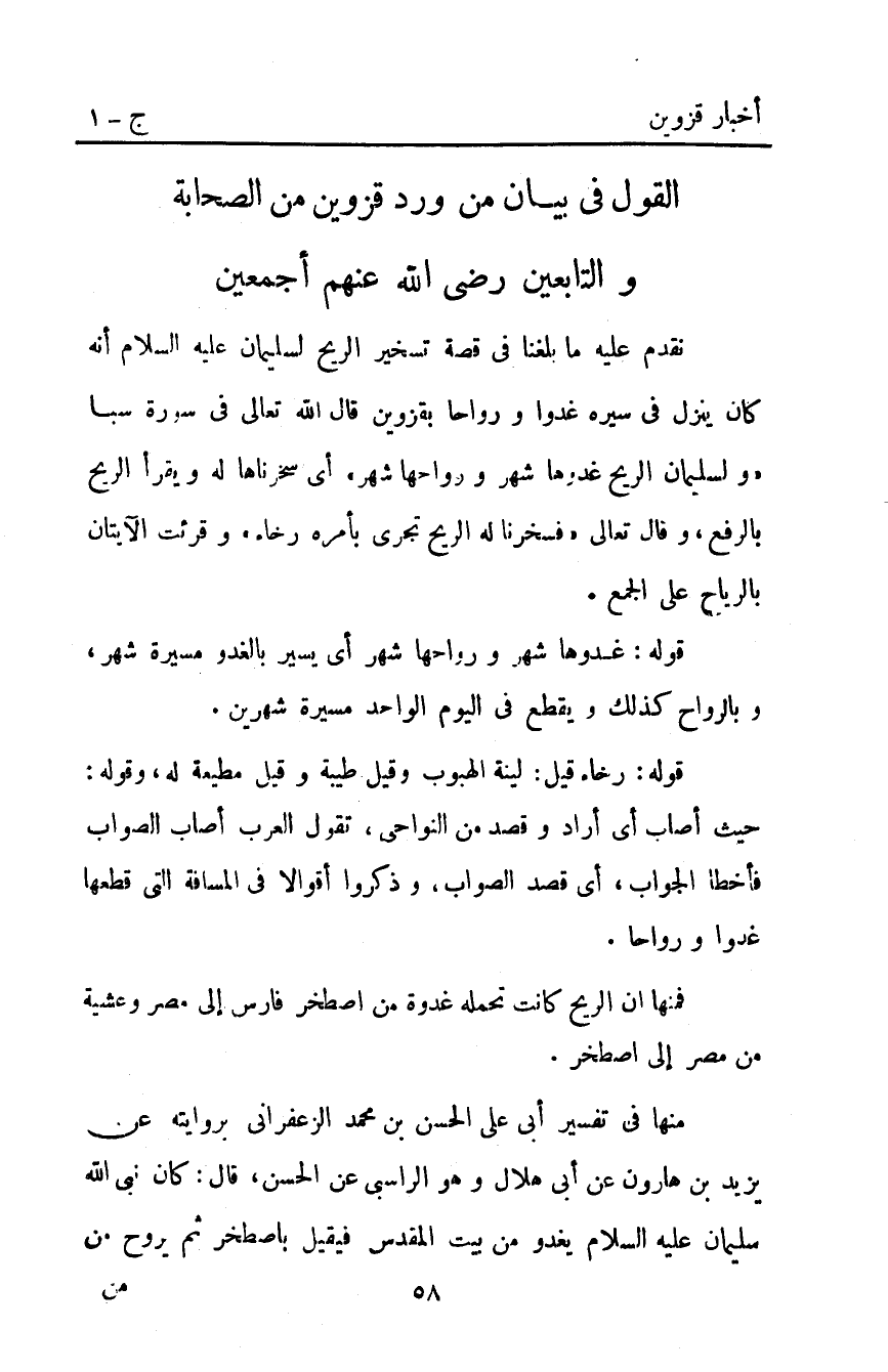 نقدم عليه ما بلغنا في قصة تسخير الريح لسليمان عليه السلام أنه كان ينزل في سيره غدوا ورواحا بقزوين قَالَ اللَّه تعالى في سورة سبأ: {وَلِسُلَيْمَانَ الرِّيحَ غُدُوُّهَا شَهْرٌ وَرَوَاحُهَا شَهْرٌ} . أي سخرناها له ويقرأ الريح بالرفع وقال تعالى: {فَسَخَّرْنَا لَهُ الرِّيحَ تَجْرِي بِأَمْرِهِ رُخَاءً} . وقرئت الآيتان بالرياح على الجمع.