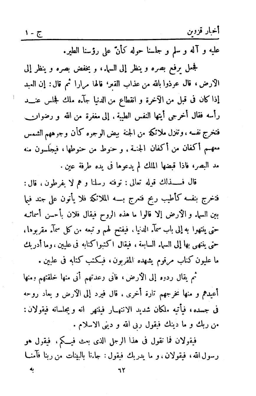 ثُمَّ يُقَالُ: رُدُّوهُ إِلَى الأَرْضِ فَإِنِّي وَعَدْتُهُمْ أَنِّي مِنْهَا خَلَقْتُهُمْ وَمِنْهَا أُعِيدُهُمْ وَمِنْهَا يُخْرِجُهُمْ تَارَةً أُخْرَى قَالَ: فَيُرَدُّ إِلَى الأَرْضِ وَيُعَادُ رُوحُهُ فِي جَسَدِهِ فَيَأْتِيهِ ملكان شديد الانْتِهَارِ فَيَنْتَهِرَانِهِ وَيَجْلِسَانِ فَيَقُولانِ: مَنْ رَبُّكَ وَمَا دِينُكَ؟ فَيَقُولُ: رَبِّي اللَّهُ وَدِينِيَ الإِسْلامُ.