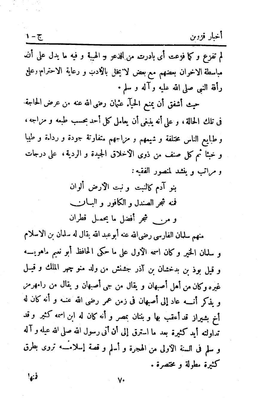 منهم: سلمان الفارسي رضي اللَّه عنه أبو عَبْد اللَّه يقال له سلمان بْن الإسلام وسلمان الخير وكان اسمه الأول على ما حكى الحافظ أبو نعيم ماهويه وقيل بوذ بْن بدخشان بْن آذر جشنش من ولد منو جهر الملك وقيل غيره وكان من أهل أصبهان ويقال:من جي أصبهان ويقال: من رامهرمز ويذكر أنه عاد إلى أصبهان في زمن عمر رضي اللَّه عنه وأنه كان له أخ بشيراز قد أعقب بها وبنتان بمصر وأنه كان له ابن اسمه كثير وقد تداولته أيد كثيرة بعد ما استرق إلى أن أتى رَسُولُ اللَّهِ صَلَّى اللَّهُ عَلَيْهِ واله وسلم في السنة الأولى من الهجرة وأسلم وقصة إسلامه تروى بطرق كثيرة مطولة ومختصرة.