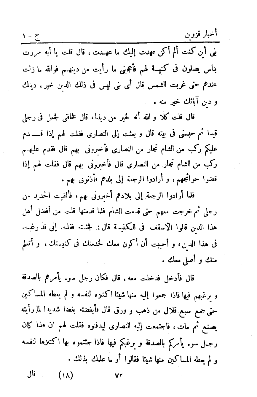 فَلَمَّا أَرَادُوا الرَّجْعَةَ إِلَى بِلادِهِمْ أَخْبَرُونِي بِهِمْ فَأَلْقَيْتُ الْحَدِيدَ مِنْ رِجْلِي ثُمَّ خَرَجْتُ مَعَهُمْ حَتَّى قَدِمْتُ الشَّامَ فلما قدمتها مَنْ أَفْضَلُ أَهْلِ هَذَا الدِّينِ قَالُوا: الأَسْقُفُّ فِي الْكَنِيسَةِ قَالَ: فَجِئْتُهُ فَقُلْتُ: إِنِّي قَدْ رَغِبْتُ فِي هَذَا الدِّينِ وَأَحْبَبْتُ أَنْ أَكُونَ مَعَكَ لِخِدْمَتِكَ فِي كَنِيسَتِكَ وَأَتَعَلَّمُ مِنْكَ وَأُصَلِّي مَعَكَ.