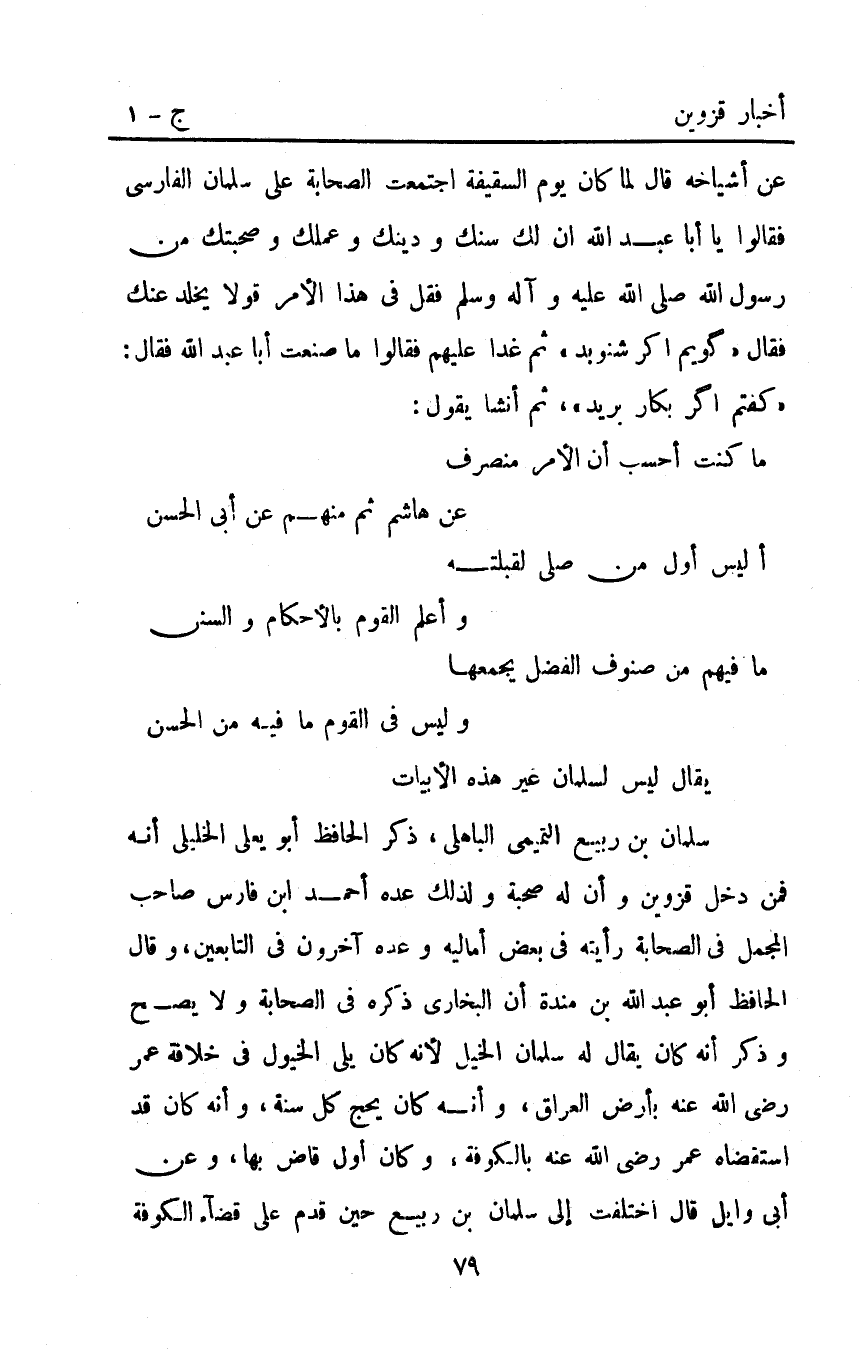 عَنْ أَشْيَاخِهِ قَالَ: لَمَّا كَانَ يَوْمُ السَّقِيفَةِ اجْتَمَعَتِ الصَّحَابَةُ عَلَى سَلْمَانَ الْفَارِسِيِّ فَقَالُوا: يَا أَبَا عَبْدِ اللَّهِ إِنَّ لَكَ سِنَّكَ وَدِينَكَ وَعَمَلَكَ وَصُحْبَتَكَ مِنْ رَسُولِ اللَّهِ صَلَّى اللَّهُ عَلَيْهِ وَآلِهِ وَسَلَّمَ فَقُلْ فِي هَذَا الأَمْرِ قَوْلا يَخْلُدُ عَنْكَ فَقَالَ: كويم أكرشنوبد ثُمَّ غَدَا عَلَيْهِمْ فَقَالُوا مَا صَنَعْتَ أَبَا عَبْدِ اللَّهِ فَقَالَ: "كفتم أكر بكار بريد" ثُمَّ أَنْشَأَ يَقُولُ: