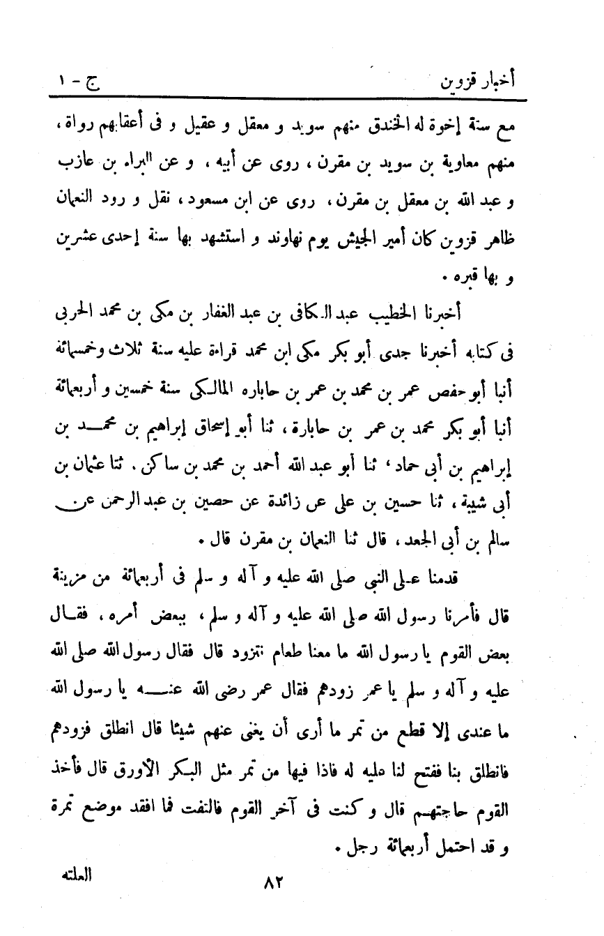 أَخْبَرَنَا الْخَطِيبُ عَبْدُ الْكَافِي بْنُ عَبْدِ الْغَفَّارِ بْنِ مَكِّيِّ بْنِ مُحَمَّدٍ الْحَرْبِيُّ فِي كِتَابِهِ أَخْبَرَنَا جَدِّي أَبُو بَكْرٍ مكي ابن مُحَمَّدٍ قِرَاءَةً عَلَيْهِ سَنَةَ ثَلاثٍ وخمسمائة أَنْبَأَ أَبُو حَفْصٍ عُمَرُ بْنُ مُحَمَّدِ بْنِ عُمَرَ بْنِ حَابَارَةَ المالكي سنة خمسين وأربعمائة أَنْبَا أَبُو بَكْرٍ مُحَمَّدُ بْنُ عُمَرَ بْنِ حَابَارَةَ ثَنَا أَبُو إِسْحَاقَ إِبْرَاهِيمُ بْنُ مُحَمَّدِ بْنِ إِبْرَاهِيمَ بْنِ أَبِي حَمَّادٍ ثَنَا أَبُو عَبْدِ اللَّهِ أَحْمَدُ بْنُ مُحَمَّدِ بْنِ سَاكِنٍ ثَنَا عُثْمَانُ بْنُ أَبِي شَيْبَةَ ثَنَا حُسَيْنُ بْنُ عَلِيٍّ عَنْ زَائِدَةَ عَنْ حُصَيْنِ بْنِ عَبْدِ الرَّحْمَنِ عَنْ سَالِمِ بْنِ أَبِي الْجَعْدِ قَالَ ثَنَا النُّعْمَانُ بْنُ مُقَرِّنٍ قَالَ: