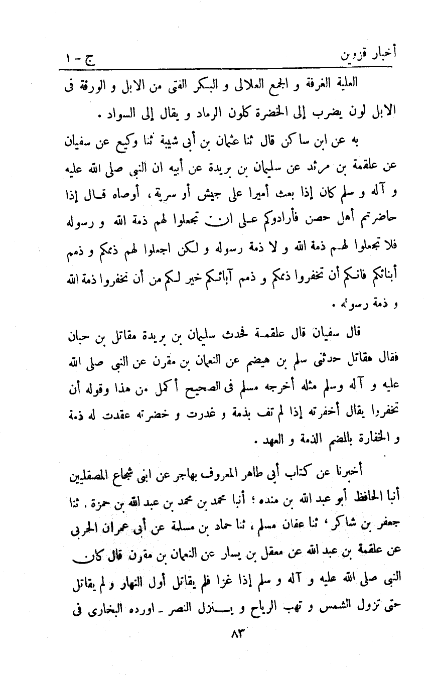 به عَنِ ابْنِ سَاكِنٍ قَالَ: ثَنَا عُثْمَانُ بْنُ أَبِي شَيْبَةَ ثَنَا وَكِيعٌ عَنْ سُفْيَانَ عَنْ عَلْقَمَةَ بْنِ مَرْثَدٍ عَنْ سُلَيْمَانَ بْنِ بُرَيْدَةَ عَنْ أَبِيهِ أَنَّ النَّبِيَّ رَسُولُ اللَّهِ صَلَّى اللَّهُ عَلَيْهِ واله وَسَلَّمَ كَانَ إِذَا بَعَثَ أَمِيرًا عَلَى جَيْشٍ أَوْ سَرِيَّةٍ أَوْصَاهُ قَالَ: "إِذَا حَاضَرْتُمْ أَهْلَ حِصْنٍ فَأَرَادُوكُمْ عَلَى أَنْ تَجْعَلُوا لَهُمْ ذِمَّةَ اللَّهِ وَرَسُولِهِ فَلا تَجْعَلُوا لَهُمْ ذِمَّةَ اللَّهِ وَلا ذِمَّةَ رَسُولِهِ وَلَكِنِ اجْعَلُوا لَهُمْ ذِمَمَكُمْ وَذِمَمَ أَبْنَائِكُمْ فَإِنَّكُمْ إِنْ تَخْفِرُوا ذِمَمَكُمْ وَذِمَمَ آبَائِكُمْ خَيْرٌ لَكُمْ مِنْ أَنْ تَخْفِرُوا ذِمَّةَ اللَّهِ وَذِمَّةَ رَسُولِهِ".