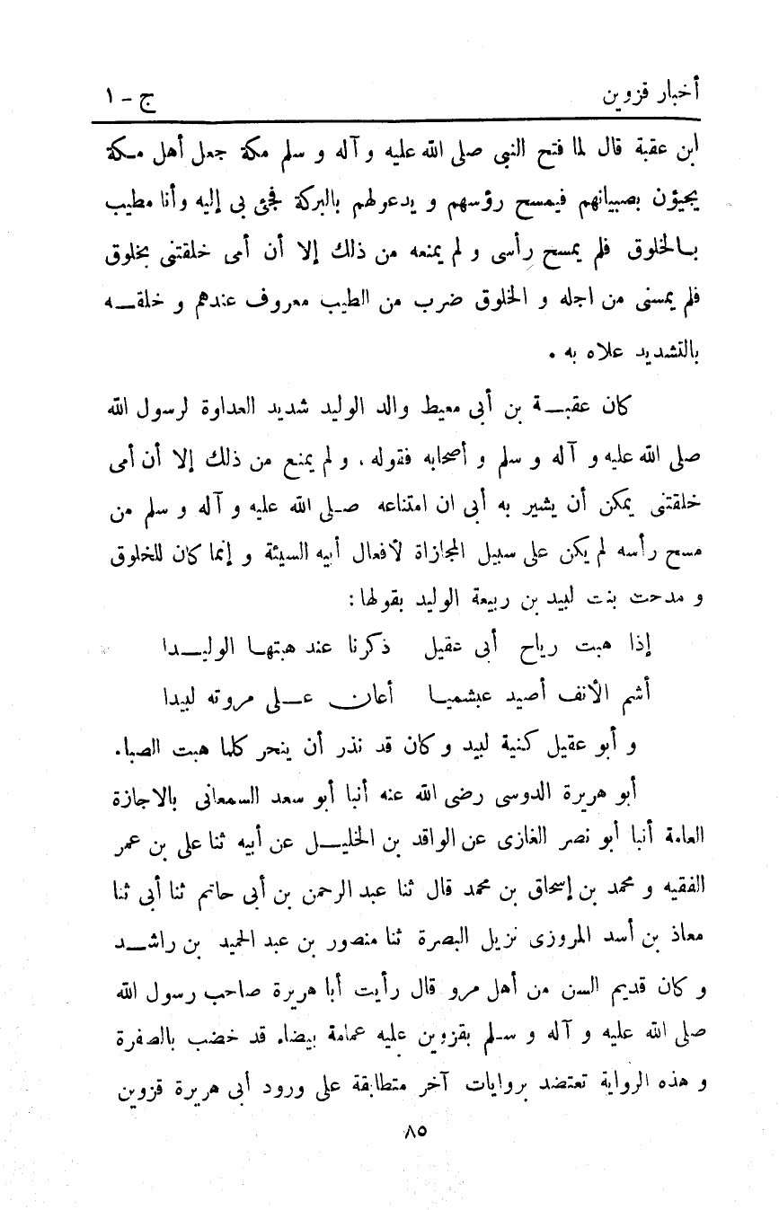 أبو هريرة الدوسي رضي اللَّه عنه أَنْبَأَ أَبُو سَعْدٍ السَّمْعَانِيُّ بِالإِجَازَةِ الْعَامَّةِ أَنْبَأَ أَبُو نَصْرٍ الْغَازِيُّ عَنِ الْوَاقِدِ بْنِ الْخَلِيلِ عَنْ أَبِيهِ ثَنَا عَلِيُّ بْنُ عُمَرَ الْفَقِيهُ وَمُحَمَّدُ بْنُ إِسْحَاقَ بْنِ مُحَمَّدٍ قَالَ ثَنَا عَبْدُ الرَّحْمَنِ بْنُ أَبِي حَاتِمٍ ثَنَا أَبِي ثَنَا مُعَاذُ بْنُ أَسَدٍ الْمَرْوَزِيُّ نَزِيلُ الْبَصْرَةِ ثَنَا مَنْصُورُ بْنُ عَبْدِ الْحَمِيدِ بْنِ رَاشِدٍ وَكَانَ قَدِيمُ السِّنِّ مِنْ أَهْلِ مَرْوَ قَالَ: رَأَيْتُ أَبَا هُرَيْرَةَ صَاحِبَ رَسُولِ اللَّهِ صَلَّى اللَّهُ عَلَيْهِ وَآلِهِ وَسَلَّمَ بِقَزْوِينَ عَلَيْهِ عِمَامَةٌ بَيْضَاءُ قَدْ خَضَّبَ بِالصُّفْرَةِ وَهَذِهِ الرِّوَايَةُ تَعْتَضِدُ بِرِوَايَاتٍ أُخَرَ مُتَطَابِقَةٍ عَلَى وُرُودِ أبي هريرة قزوين
