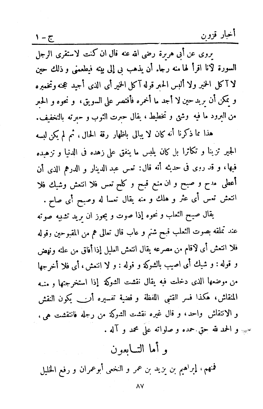 يُرْوَى عَنْ أَبِي هُرَيْرَةَ رَضِيَ اللَّهُ عَنْهُ قَالَ: إِنْ كُنْتُ لأَسْتَقْرِي الرَّجُلَ السُّورَةَ لأَنَا أَقْرَأُ لَهَا مِنْهُ رَجَاءَ أَنْ يَذْهَبَ بِي إِلَى بَيْتِهِ فَيُطْعِمَنِي وَذَلِكَ حِينَ لا آكُلُ الْخَمِيرَ وَلا أَلْبَسُ الْحَبَرَ قَوْلُهُ: "آكُلُ الْخَمِيرَ" أَيْ الَّذِي أُجِيدُ عَجْنَهُ وَتَخْمِيرَهُ وَيُمْكِنُ أَنْ يُرِيدَ حِينَ لا أَجِدُ مَا أُخَمِّرُهُ فَأَقْتَصِرُ عَلَى السَّوِيقِ وَنَحْوِهِ وَالْحَبَرُ مِنَ الْبُرُودِ مَا فِيهِ وَشَيْءٌ وَتَخْطِيطٌ يُقَالُ حَبَّرْتُ الثَّوْبَ وَحَبَرَتُهُ بِالتَّخْفِيفِ.