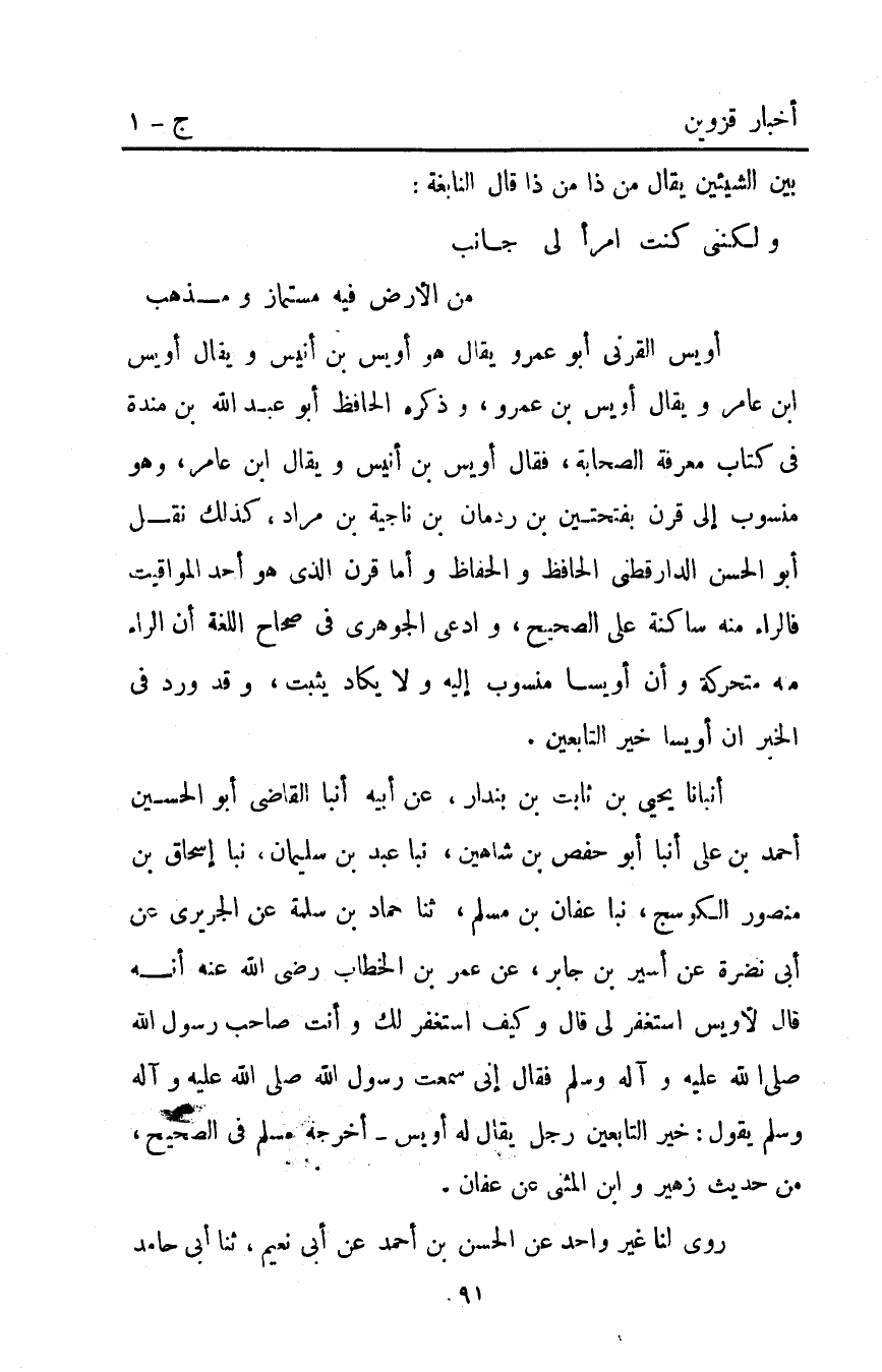 أَنْبَأَنَا يَحْيَى بْنُ ثَابِتِ بْنِ بُنْدَارٍ عَنْ أَبِيهِ أَنْبَأَ الْقَاضِي أَبُو الْحُسَيْنِ أَحْمَدُ بْنُ عَلِيٍّ أَنْبَأَ أَبُو حَفْصِ بْنُ شَاهِينَ نَبَّأَ عَبْدُ بْنُ سُلَيْمَانَ نَبَّأَ إِسْحَاقُ بْنُ مَنْصُورٍ الكَوْسَجُ نَبَّأَ عَفَّانُ بْنُ مُسْلِمٍ ثنا حَمَّادُ بْنُ سَلَمَةَ عَنْ الْجُرَيْرِيِّ عَنْ أَبِي نَضْرَةَ عَنْ أَسِيرِ بْنِ جَابِرٍ عَنْ عُمَرَ بْن الخطاب رضي اللَّه عنه أَنَّهُ قَالَ لأُوَيْسٍ اسْتَغْفِرْ لِي قَالَ: وَكَيْفَ أَسْتَغْفِرُ لَكَ وَأَنْتَ صَاحِبَ رَسُولِ اللَّهِ صَلَّى اللَّهُ عليه واله وَسَلَّمَ فَقَالَ إِنِّي سَمِعْتُ رَسُولَ اللَّهِ صَلَّى اللَّهُ عَلَيْهِ وَآلِهِ وَسَلَّمَ يَقُولُ: "خَيْرُ التَّابِعِينَ رَجُلٌ يُقَالُ لَهُ أُوَيْسٌ". أَخْرَجَهُ مُسْلِمٌ فِي الصَّحِيحِ مِنْ حَدِيثِ زُهَيْرٍ وَابْنُ الْمُثَنَّى عَنْ عَفَّانَ.