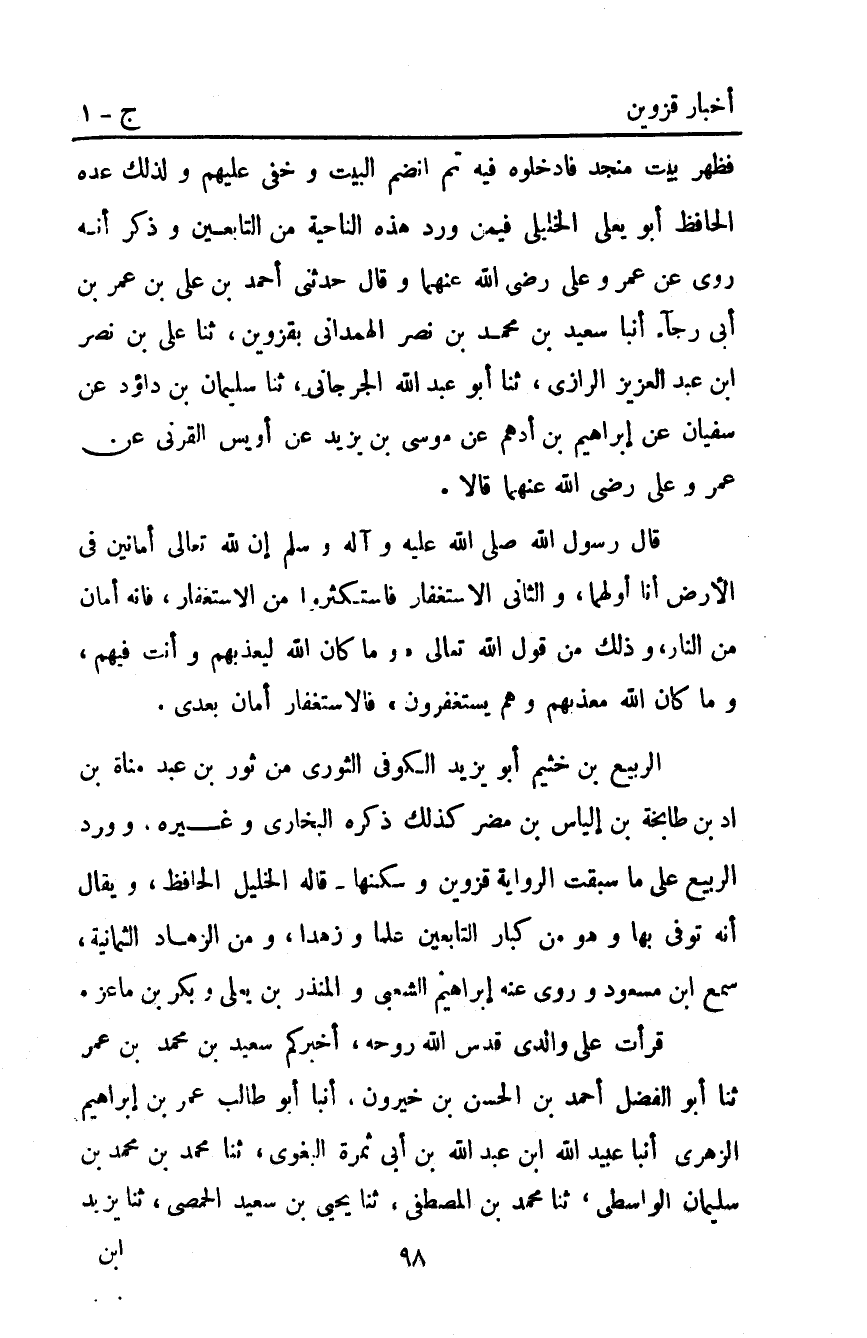 الربيع بْن خثيم أبو يزيد الكوفي الثوري من ثور بْن عبد مناة بْن إد بْن طابخة بْن إلياس بْن مضر كذلك ذكره البخاري وغيره وورد الربيع على ما سبقت الرواية قزوين وسكنها قاله الخليل الحافظ ويقال: أنه توفي بها وهو من كبار التابعين علما وزهدا ومن الزهاد الثمانية سمع ابن مسعود وروى عنه إبراهيم الشعبي والمنذر بْن يعلى وبكر بْن ماعز قرأت على والدي قدس اللَّه روحه أخبركم سعيد بْن مُحَمَّد بْن عمر ثنا أبو الفضل أَحْمَد بْنُ الْحَسَنِ بْنِ خَيْرُونَ أَنْبَأَ أبو طالب عمر بْن إبراهيم الزهري أنبأ عبيد اللَّه ابن عَبْد اللَّه بْن أبي ثمرة البغوي ثنا مُحَمَّد بْن مُحَمَّد بْن سليمان الواسطي ثنا مُحَمَّد بْن المصطفى ثنا يحيى بْن سعيد الحمصي ثنا يزيد