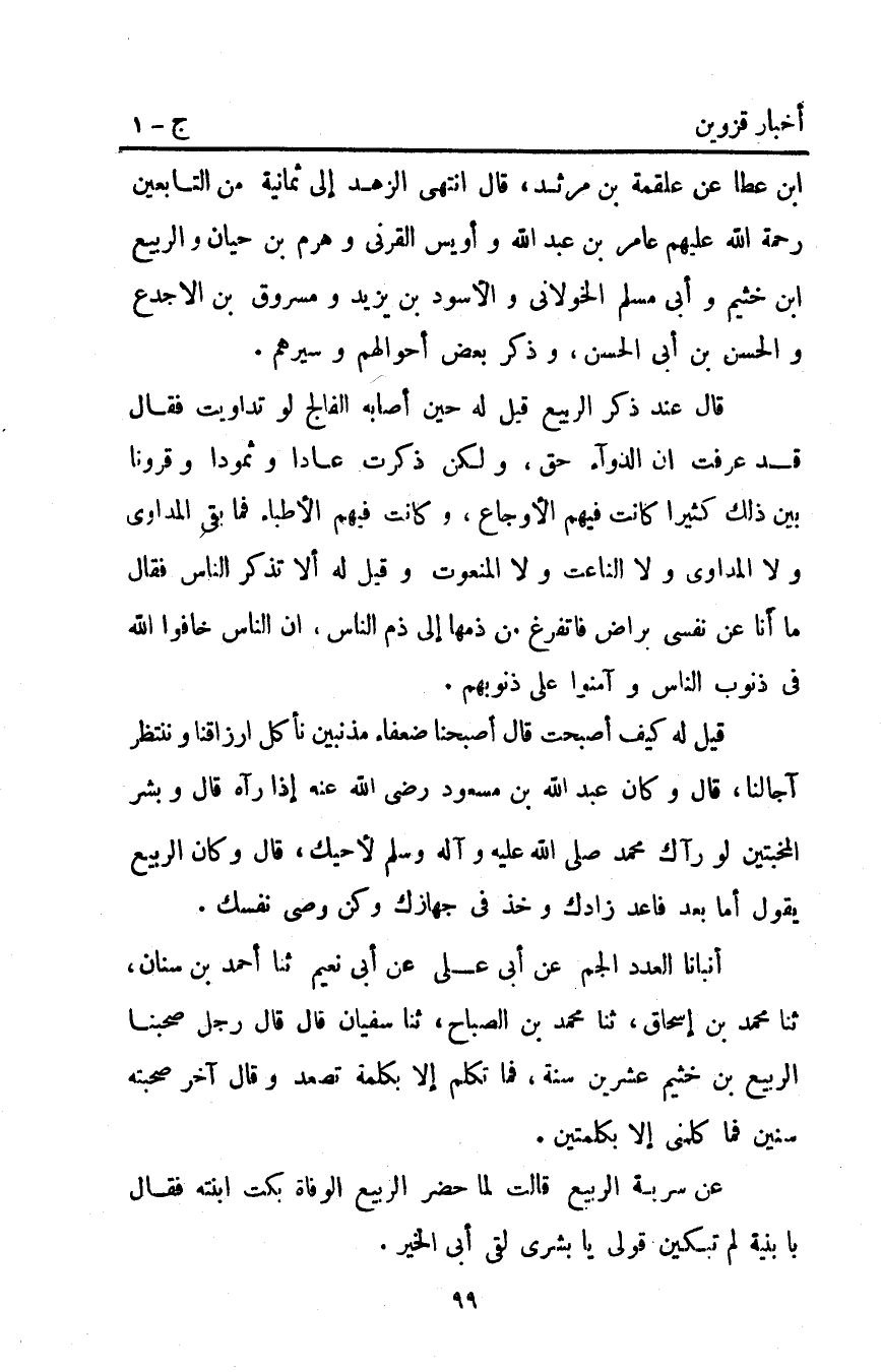 أنبأنا العدد الجم عن أبي علي عن أبي نعيم ثنا أَحْمَد بْن سنان ثنا مُحَمَّد بْن إسحاق ثنا مُحَمَّد بن الصباح ثنا سفيان قَالَ: قَالَ رجل: صحبنا الربيع بْن خثيم عشرين سنة فما تكلم إلا بكلمة تصعد وقال آخر: صحبته سنين فما كلمني إلا بكلمتين.