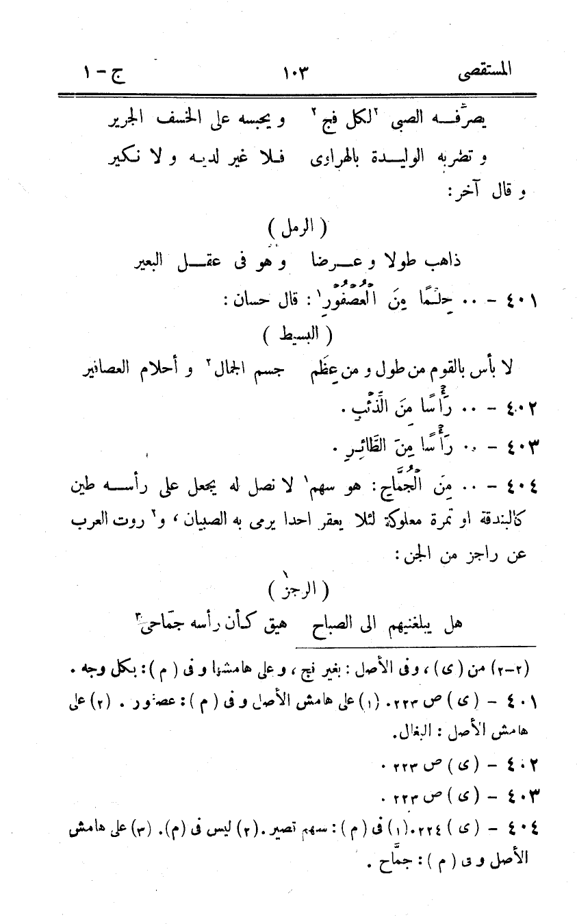 404 - 00 من الجماح هُوَ سهم لَا نصل لَهُ يَجْعَل على رَأسه طين كالبندقة اَوْ تَمْرَة معلوكة لِئَلَّا يعقر أحدا يَرْمِي بِهِ الصّبيان وروت الْعَرَب عَن راجز من الْجِنّ