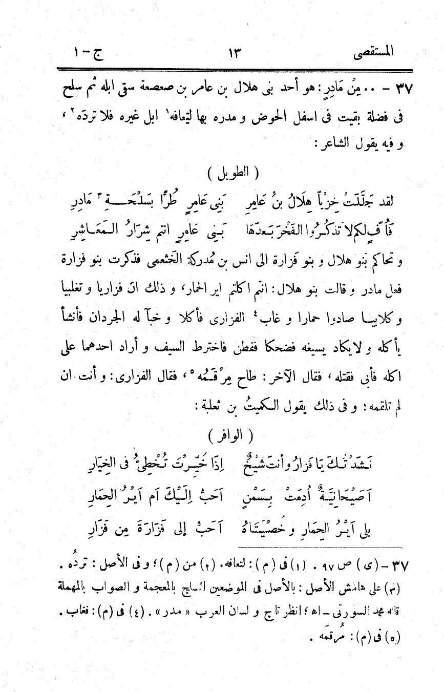 37 - من مادر هُوَ أحد بنى هِلَال بن عَامر بن صعصعة سقى إبِله ثمَّ سلح فِي فضلَة بقيت فِي أَسْفَل الْحَوْض ومدره بهَا ليعافه إبل غَيره فَلَا ترده وَفِيه يَقُول الشَّاعِر