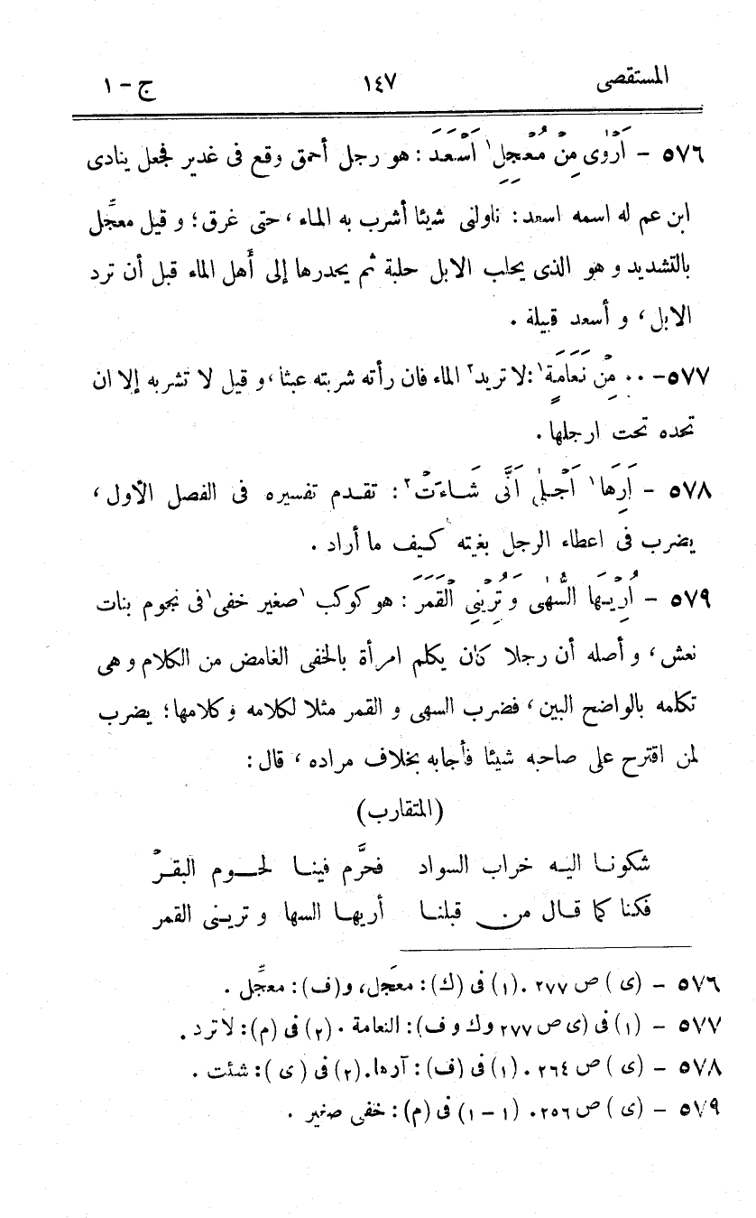 579 - اريها السهى وتريني الْقَمَر هُوَ كَوْكَب صَغِير خَفِي فِي نُجُوم بَنَات نعش وَأَصله أَن رجلا كَانَ يكلم امْرَأَة بالخفي الغامض من الْكَلَام وَهِي تكَلمه بالواضح الْبَين فَضرب السهى وَالْقَمَر مثلا لكَلَامه وكلامها يضْرب لمن اقترح على صَاحبه شَيْئا فَأَجَابَهُ بِخِلَاف مُرَاده قَالَ