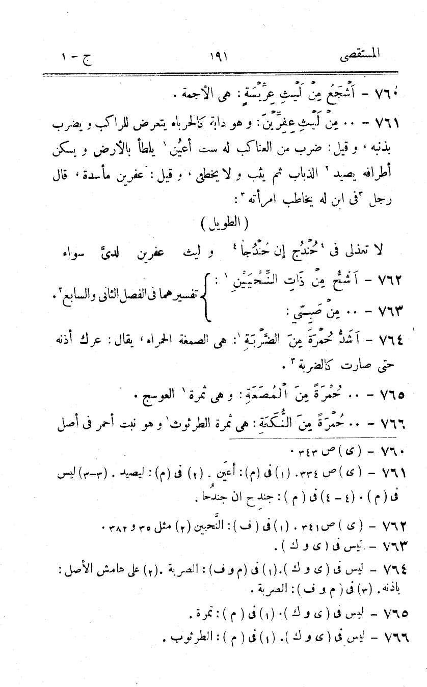 (764 - أَشد حمرَة من الضَّرْبَة هِيَ الصمغة الْحَمْرَاء يُقَال عَرك أُذُنه حَتَّى صَارَت كالضربة