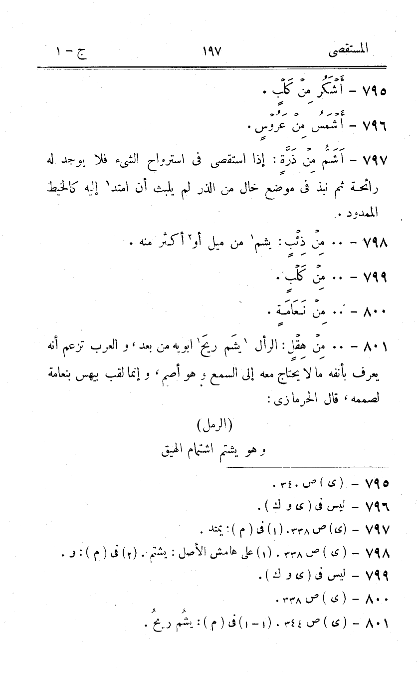 797 - اشم من ذرة إِذا استقصى فِي استرواح الشَّيْء فَلَا يُوجد لَهُ رَائِحَة ثمَّ نبذ فِي مَوضِع خَال من الذَّر لم يلبث أَن امْتَدَّ إِلَيْهِ كالخيط الْمَمْدُود