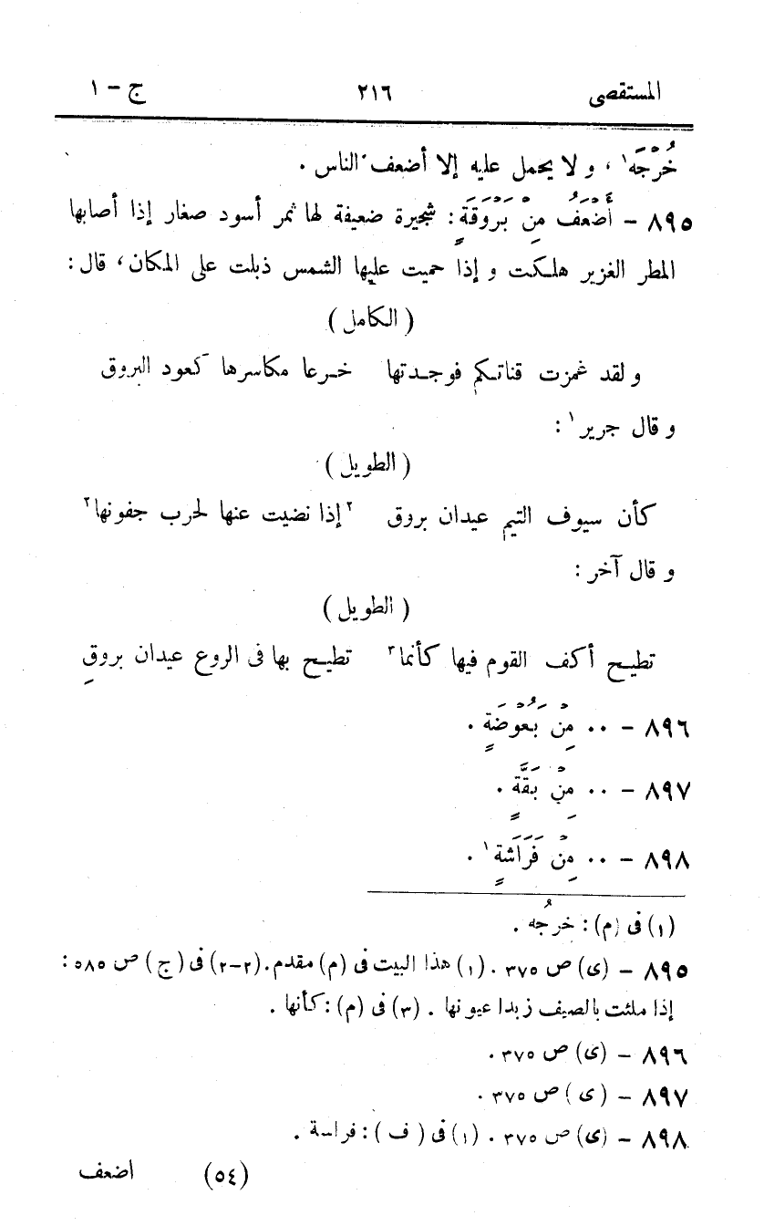 895 - أَضْعَف من بروقة شجيرة ضَعِيفَة لَهَا ثَمَر أسود صغَار إِذا أَصَابَهَا الْمَطَر الغزير هَلَكت وَإِذا حميت عَلَيْهَا الشَّمْس ذبلت على الْمَكَان قَالَ