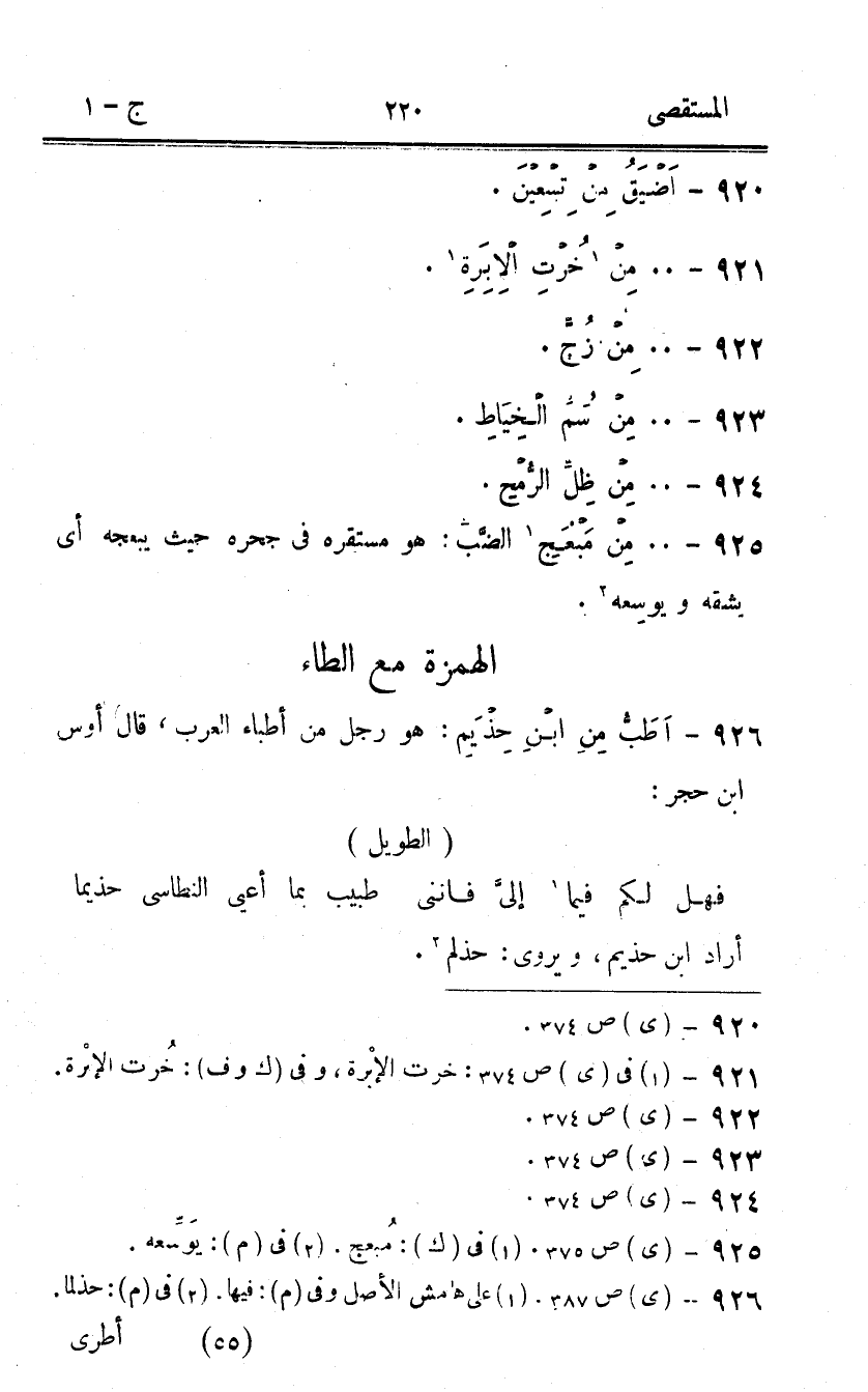 926 - اطب من ابْن حذيم هُوَ رجل من أطباء الْعَرَب قَالَ أَوْس ابْن حجر