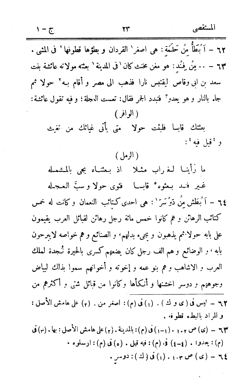 63 - 00 من فند هُوَ مغن مخنث كَانَ فِي الْمَدِينَة بعثته مولاته عَائِشَة بنت سعد بن أبي وَقاص ليقتبس نَارا فَذهب إِلَى مصر وَأقَام بِهِ حولا ثمَّ جَاءَ بالنَّار وَهُوَ يعدو فتبدد الْجَمْر فَقَالَ تعست العجلة وَفِيه تَقول عَائِشَة