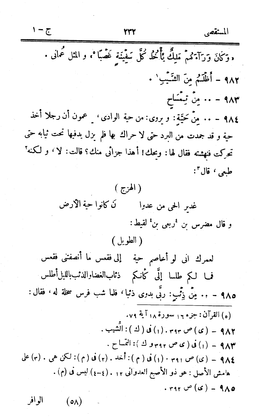 984 - من حَيَّة ويروى من حَيَّة الْوَادي يَزْعمُونَ أَن رجلا أَخذ حَيَّة وَقد جمدت من الْبرد حَتَّى لَا حراك بهَا فَلم يزل يدفيها تَحت ثِيَابه حَتَّى تحركت فنهشته فَقَالَ لَهَا وَيحك أَهَذا جزائي مِنْك قَالَت لَا وَلكنه طبعي قَالَ
