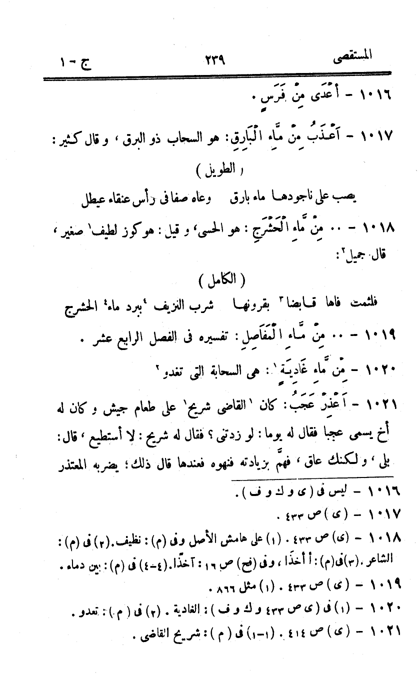 1018 - من مَاء الحشرج هُوَ الحسى وَقيل هُوَ كوز لطيف صَغِير قَالَ جميل
