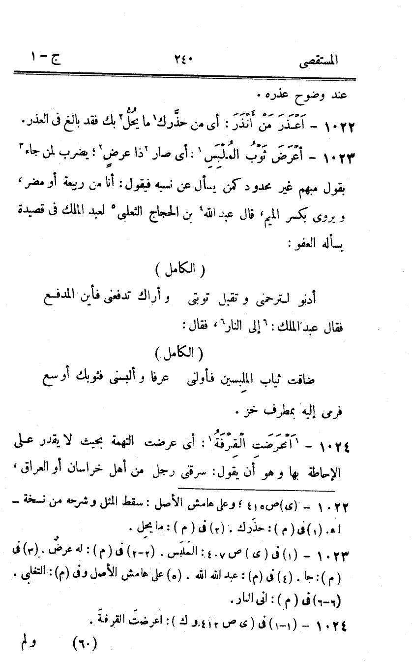 1023 - أعرض ثوب الملبس أَي صَار ذَا عرض يضْرب لمن جَاءَ بقول مُبْهَم غير مَحْدُود كمن يسْأَل عَن نسبه فَيَقُول أَنا من ربيعَة أَو مُضر ويروى بِكَسْر الْمِيم قَالَ عبد الله بن الْحجَّاج الثَّعْلَبِيّ لعبد الْملك فِي قصيدة يسْأَله الْعَفو