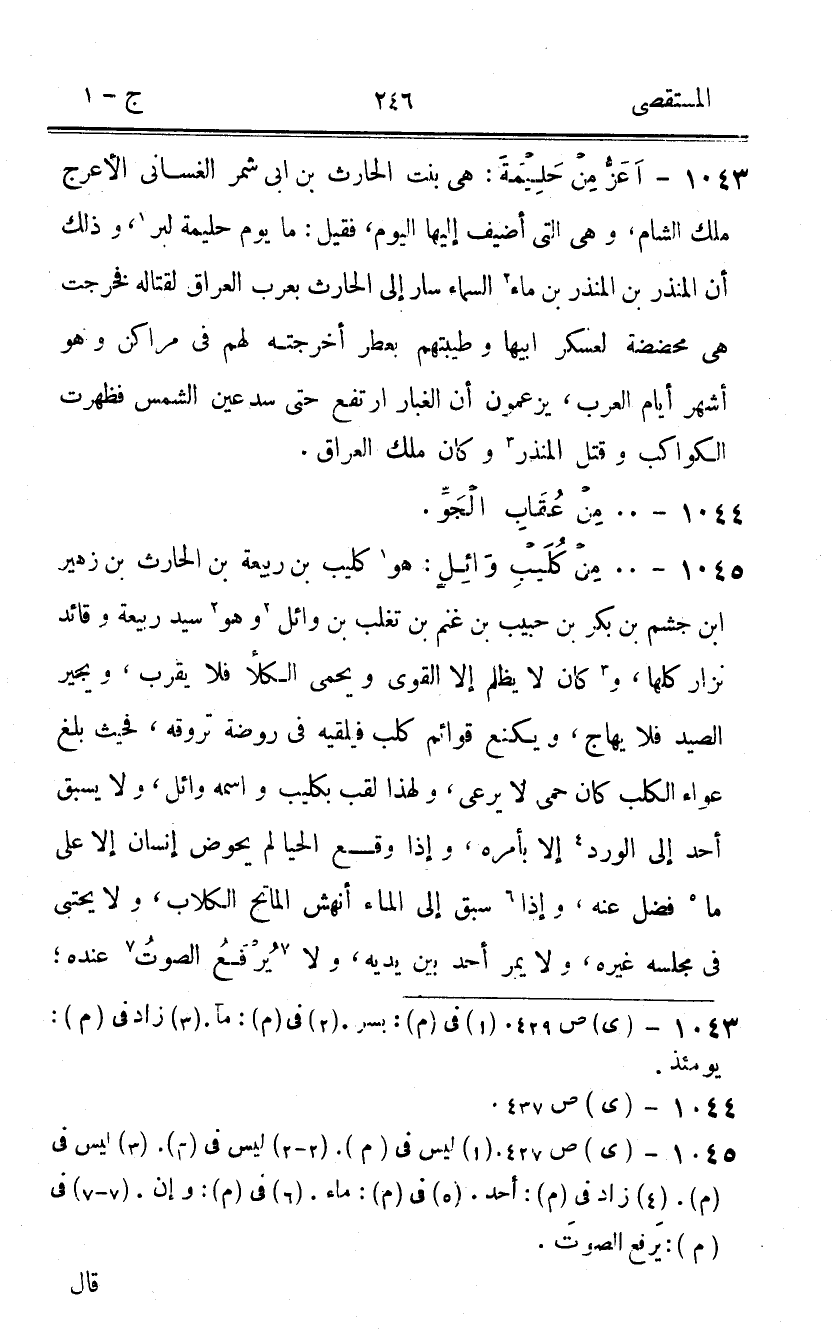 1045 - 00 من كُلَيْب وَائِل هُوَ كُلَيْب بن ربيعَة بن الْحَارِث بن زُهَيْر بن جشم بن بكر بن حبيب بن غنم بن تغلب بن وَائِل وَهُوَ سيد ربيعَة وقائد نزار كلهَا وَكَانَ لَا يظلم إِلَّا الْقوي ويحمى الْكلأ فَلَا يقرب وَيُجِير الصَّيْد فَلَا يهاج ويكنع قَوَائِم كلب فيلقيه فى رَوْضَة تروقه فَحَيْثُ بلغ عواء الْكَلْب كَانَ حمى لَا يرْعَى وَلِهَذَا لقب بكليب واسْمه وَائِل وَلَا يسْبق أحد إِلَى الْورْد إِلَّا بأَمْره وَإِذا وَقع الحيا لم يحوض إِنْسَان إِلَّا على مَا فضل عَنهُ وَإِذا سبق إِلَى المَاء أنهش الماتح الْكلاب وَلَا يحتبى فى مَجْلِسه غَيره وَلَا يمر أحد بَين يَدَيْهِ وَلَا يرفع الصَّوْت عِنْده