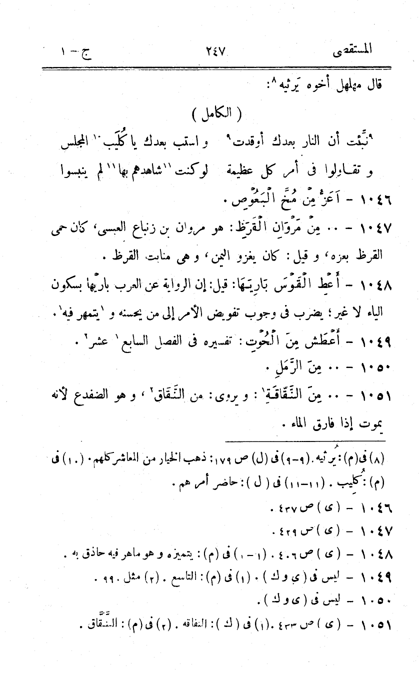 (نبئت أَن النَّار بعْدك أوقدت ... واستب بعْدك يَا كُلَيْب الْمجْلس)