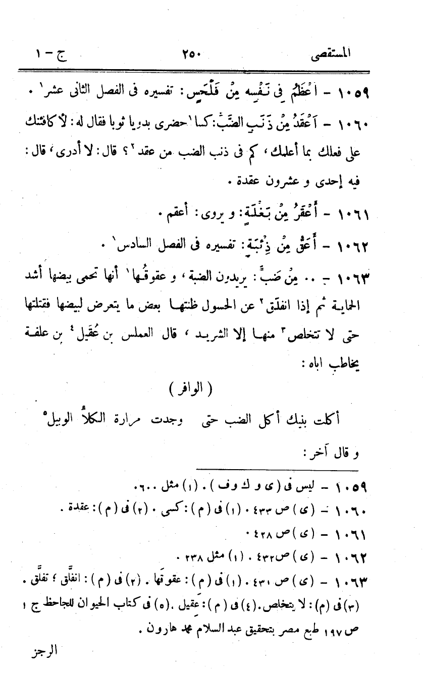 1060 - اعقد من ذَنْب الضَّب كسا حضري بدويا ثوبا فَقَالَ لَهُ لأكافئنك على فعلك بِمَا أعلمك كم فِي ذَنْب الضَّب من عقد قَالَ لَا أدرى قَالَ فِيهِ إِحْدَى وَعِشْرُونَ عقدَة