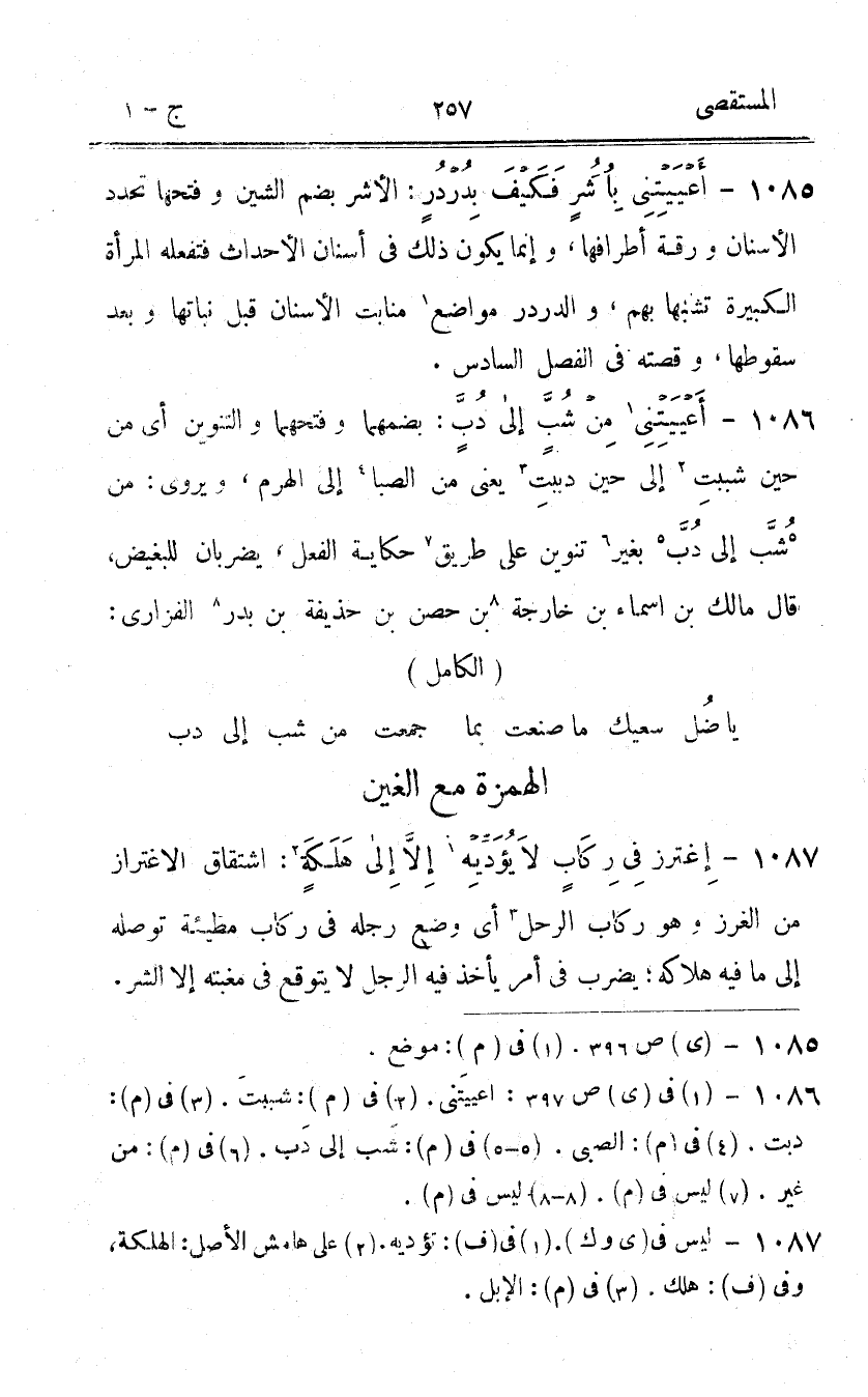 1085 - أعييتني بأشر فَكيف بدردر الأشر بِضَم الشين وَفتحهَا تحدد الْأَسْنَان ورقة أطرافها وَإِنَّمَا يكون ذَلِك فى أَسْنَان الْأَحْدَاث فتفعله الْمَرْأَة الْكَبِيرَة تشبها بهم والدردر مَوَاضِع منابت الْأَسْنَان قبل نباتها وَبعد سُقُوطهَا وقصته فِي الْفَصْل السَّادِس