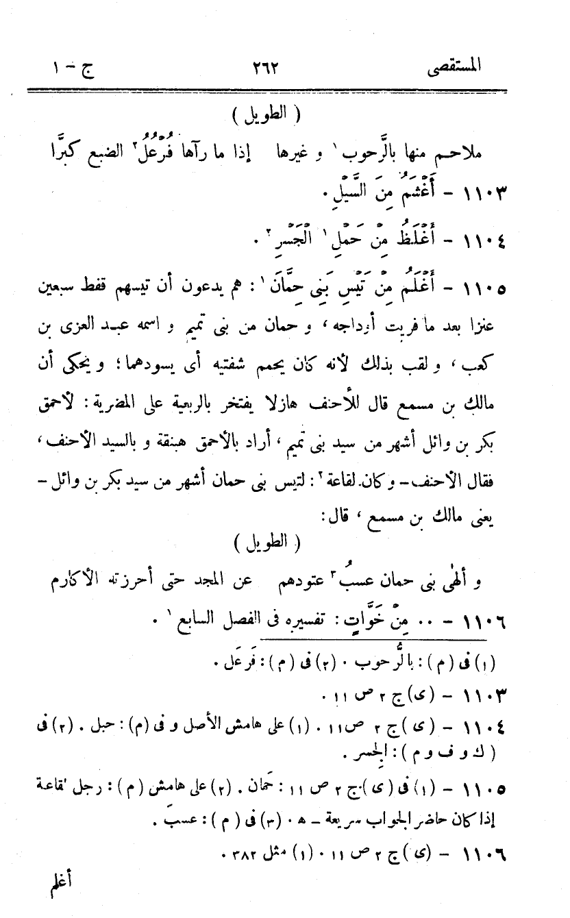 1105 - أغلم من تَيْس بني حمان هم يدعونَ أَن تيسهم فَقَط سبعين عَنْزًا بعد مَا فريت أوداجه وحمان من بني تَمِيم واسْمه عبد الْعُزَّى بن كَعْب ولقب بذلك لِأَنَّهُ كَانَ يحمم شَفَتَيْه أى يسودهما ويحكى أَن مَالك بن مسمع قَالَ للأحنف هازلا يفتخر بالربعية على المضرية لأحمق بكر بن وَائِل أشهر من سيد بني تَمِيم أَرَادَ بالأحمق هبنقة وبالسيد الْأَحْنَف فَقَالَ الْأَحْنَف وَكَانَ لقاعة لتيس بني حمان أشهر من سيد بكر بن وَائِل يَعْنِي مَالك بن مسمع قَالَ