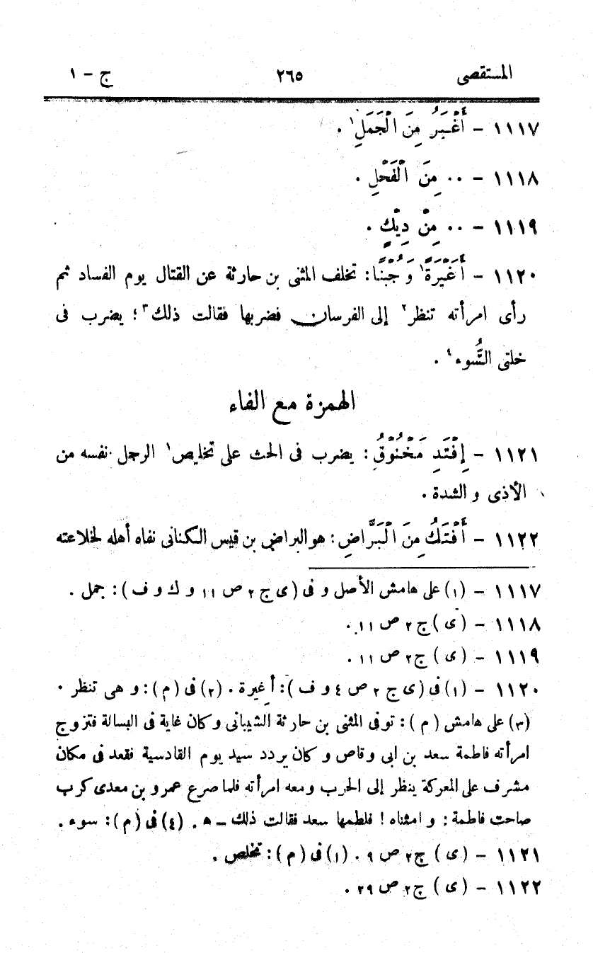 1120 - أغيرة وجبنا تخلف الْمثنى بن حَارِثَة عَن الْقِتَال يَوْم الْفساد ثمَّ رأى امْرَأَته تنظر إِلَى الفرسان فضربها فَقَالَ ذَلِك يضْرب فِي خلتي السوء