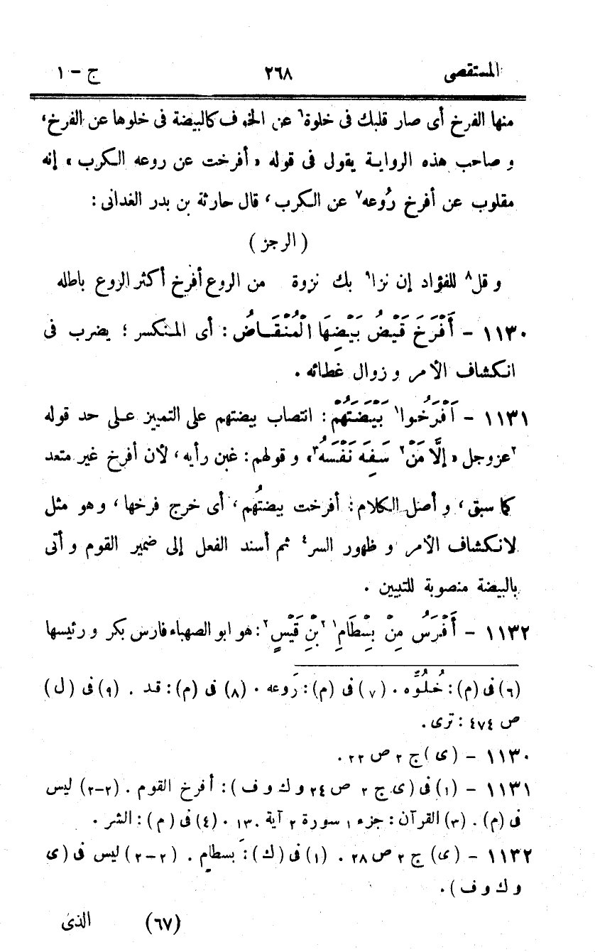 1131 - افرخوا بيضتهم انتصاب بيضتهم على التَّمْيِيز على حد قَوْله عز وَجل {إِلَّا من سفه نَفسه} وَقَوْلهمْ غبن رَأْيه لِأَن أفرخ غير مُتَعَدٍّ كَمَا سبق وأصل الْكَلَام أفرخت بيضتهم أى خرج فرخها وَهُوَ مثل لانكشاف الْأَمر وَظُهُور السِّرّ ثمَّ اسند الْفِعْل إِلَى ضمير الْقَوْم وأتى بالبيضة مَنْصُوبَة للتبيين