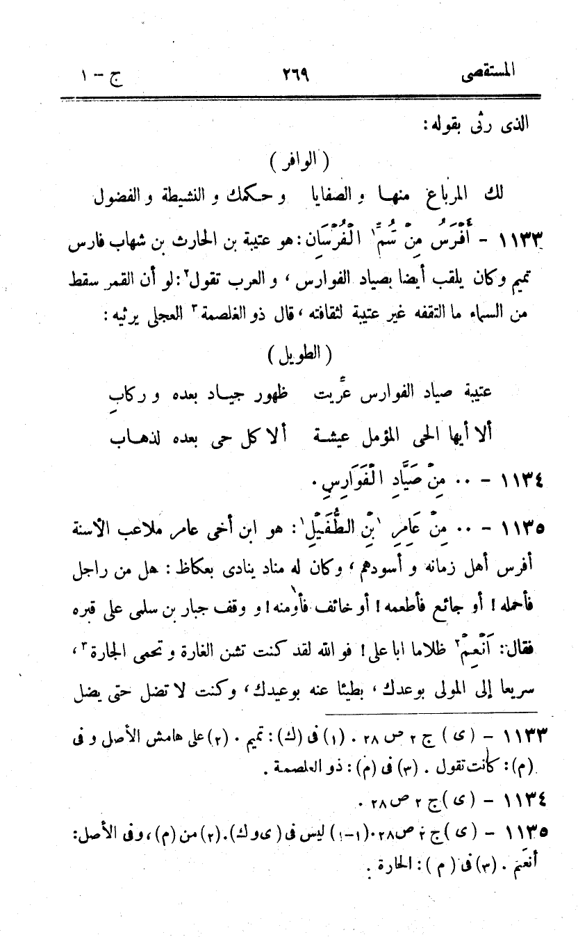 1133 - أَفرس من سم الفرسان هُوَ عتيبة بن الْحَارِث بن شهَاب فَارس تَمِيم وَكَانَ يلقب أَيْضا بصياد الفوارس وَالْعرب تَقول لَو أَن الْقَمَر سقط من السَّمَاء مَا التقفه غير عتيبة لثقافته قَالَ ذُو الغلصمة الْعجلِيّ يرثيه