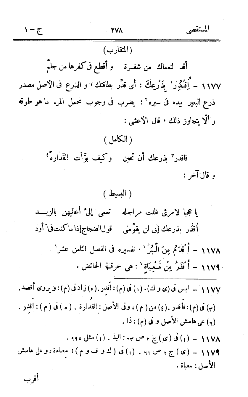 1177 - اقدر بذرعك أَي قدر بطاقتك والذرع فِي الأَصْل مصدر ذرع الْبَعِير بِيَدِهِ فِي سيره يضْرب فى وجوب تحمل الْمَرْء مَا هُوَ طوقه وَألا يتَجَاوَز ذَلِك قَالَ الْأَعْشَى